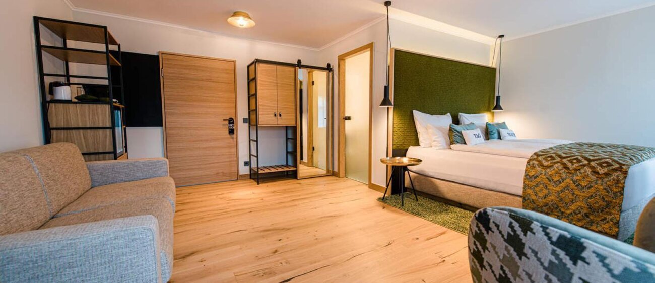 Hier trifft modernes Design auf regionales Erlebnis: 26 Zimmer in warmen Farben und frechen Mustern – Boxspringbetten, praktisches Möbeldesign, dazu eine Espressomaschine und ein Weinkühlschrank laden zu einem unvergesslichen Aufenthalt in der Kleinstadt ein.