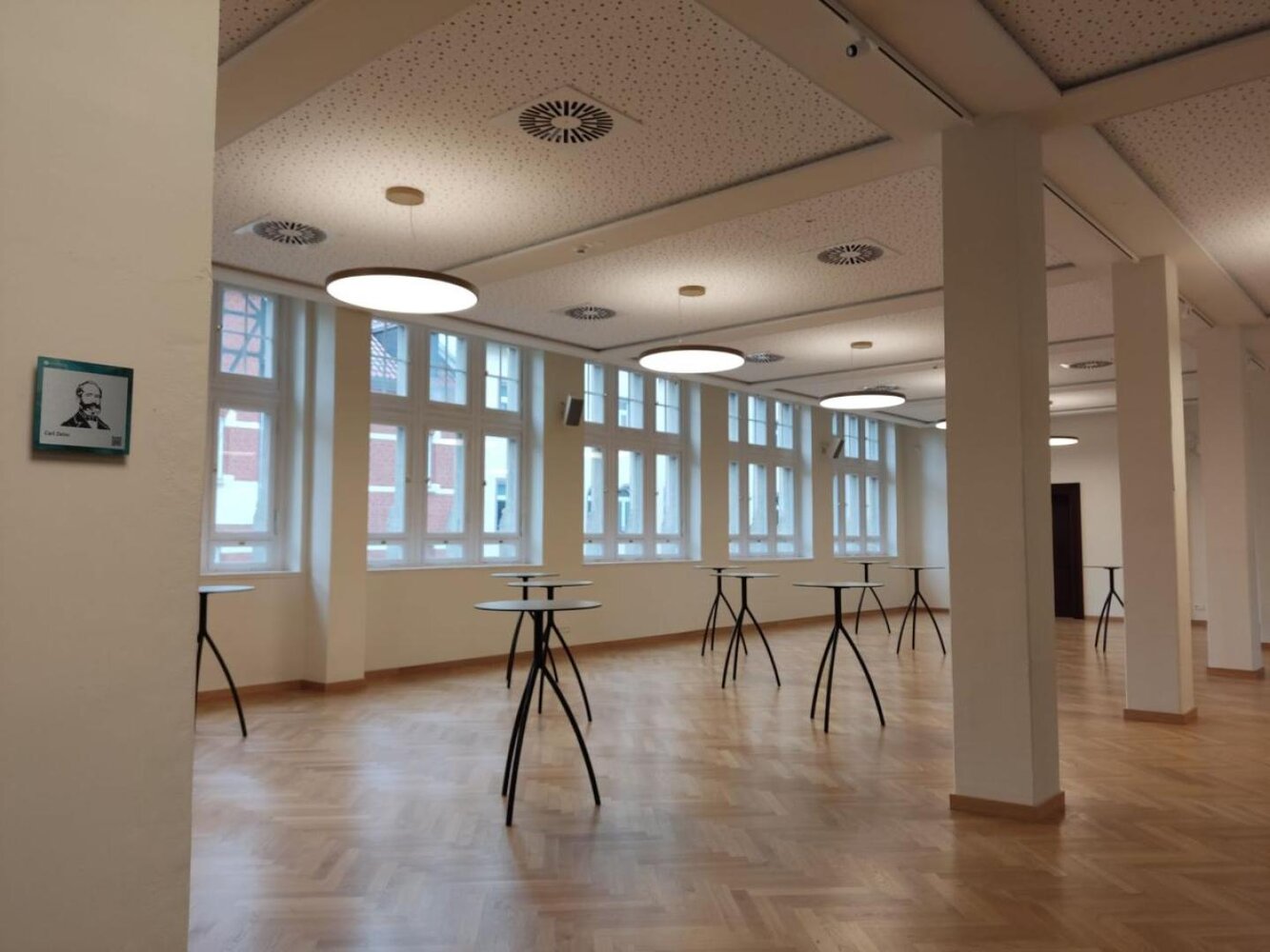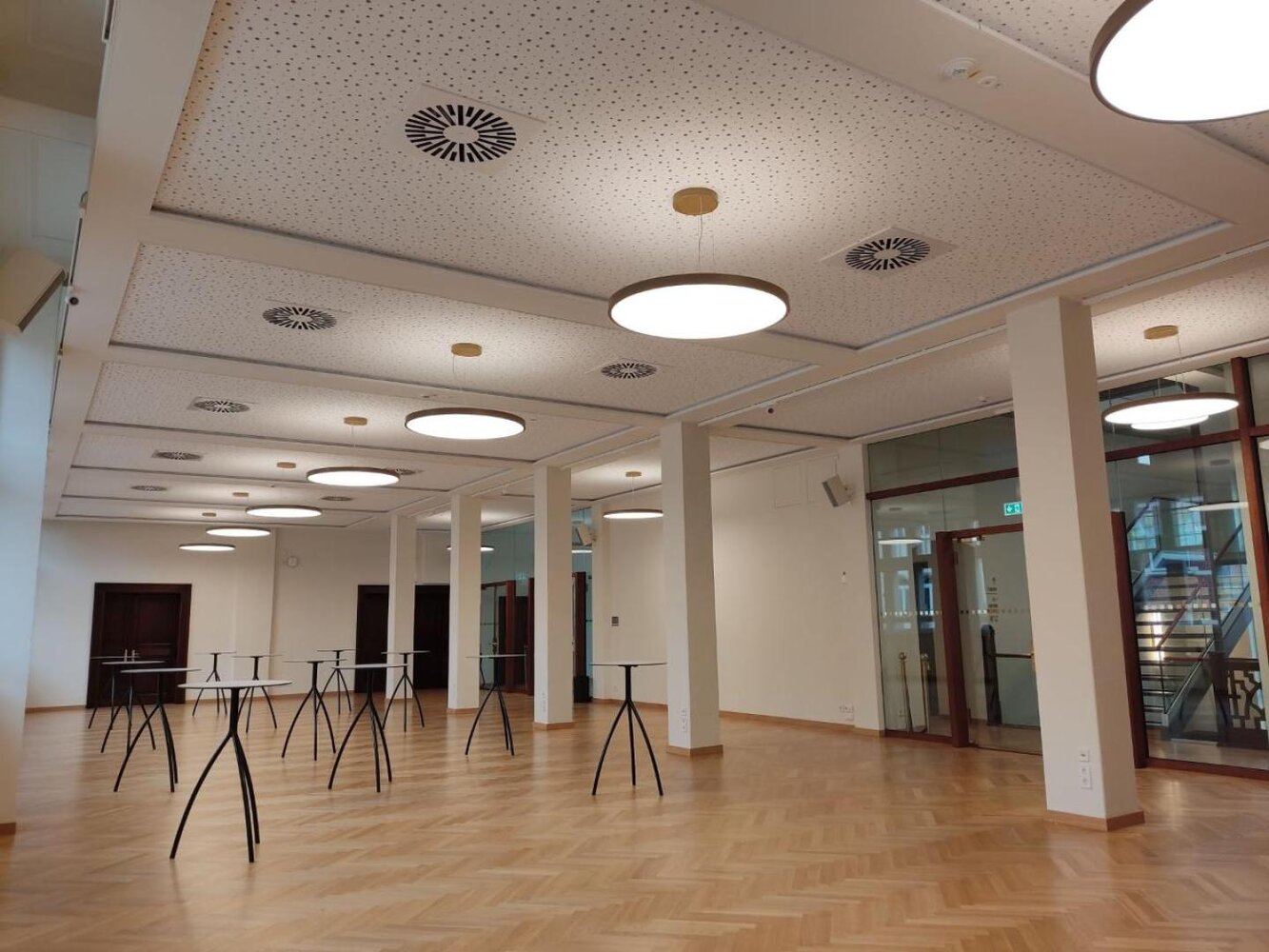 Hier im ersten Obergeschoss des Turmgebäudes ist ausreichend Platz für Empfänge, Ausstellungen und Netzwerk-Veranstaltungen. Bei Bedarf kann ein Teil des Raums als Catering-Standort eingerichtet werden.