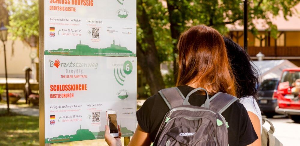 Auf rund 1,5 Kilometern lädt der Weg mit zwölf Stationen dazu ein, das Kleinod im Droyßiger-Zeitzer Forst zu entdecken. Station 4, die Bärentradition, gab der Tour übrigens ihren Namen: Über 70 gusseiserne Bärentatzen, entworfen von Roland Lindner, sind in den Boden eingelassen und markieren den Pfad, sehr zur Freude der Kinder. Erleb- und erfahrbar wird die Geschichte Droyßigs über einen kostenlosen Audioguide, der individuell auf Deutsch oder Englisch per Smartphone abrufbar ist. Eingesprochen wurde er von Schülerinnen und Schülern des CJD Gymnasiums Droyßig.