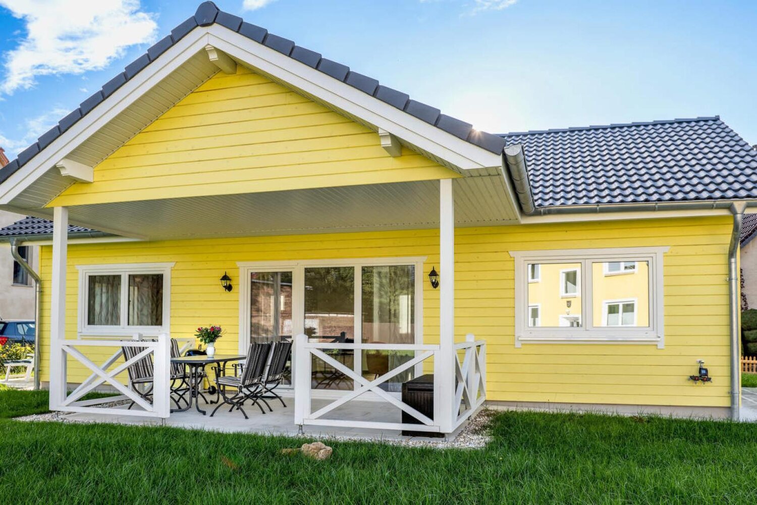 Das Wohnzimmer hat eine gemütliche Fernsehecke und einen Essbereich mit ausreichend Platz für vier Personen. Im Garten haben wir für Sie Liegestühle, Terrassenmöbel und einen Grill bereitstehen. Für Ihre kleinen Kinder haben wir einen Hochstuhl und ein Reisebett. Sollte es einmal regnen, haben wir Bücher und Gesellschaftsspiele bereitliegen.