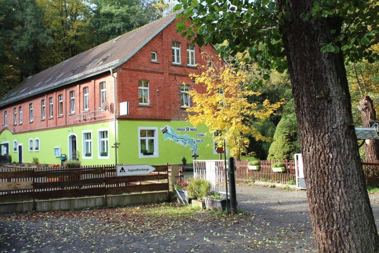Die ehemalige Säge- und Getreidemühle liegt im idyllischen Mühltal im Thüringer Holzland. Das Haus mit 122 Betten in 33 Zimmern, riesigem Außengelände mit Spiel-, Volleyball- und Bolzplatz sowie einem kleinen Tiergehege ist prädestiniert, eine einzigartige Natur zu entdecken. Auf dem Gelände befindet sich ein kleines Tiergehege. Zudem kann man sich auf Försters Spuren begeben oder Falknern auf der Jagd zusehen.