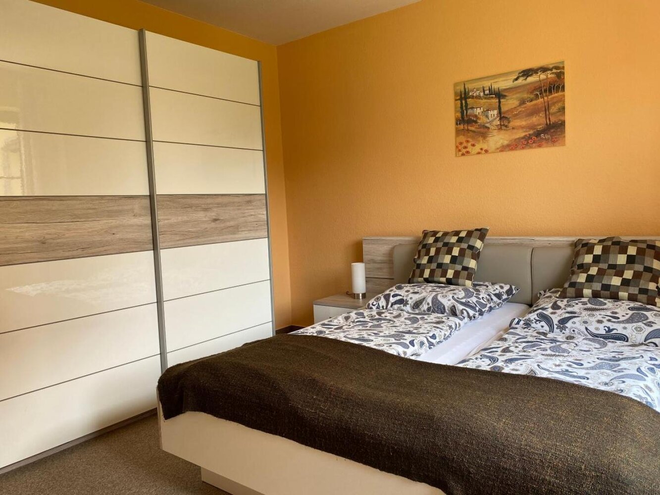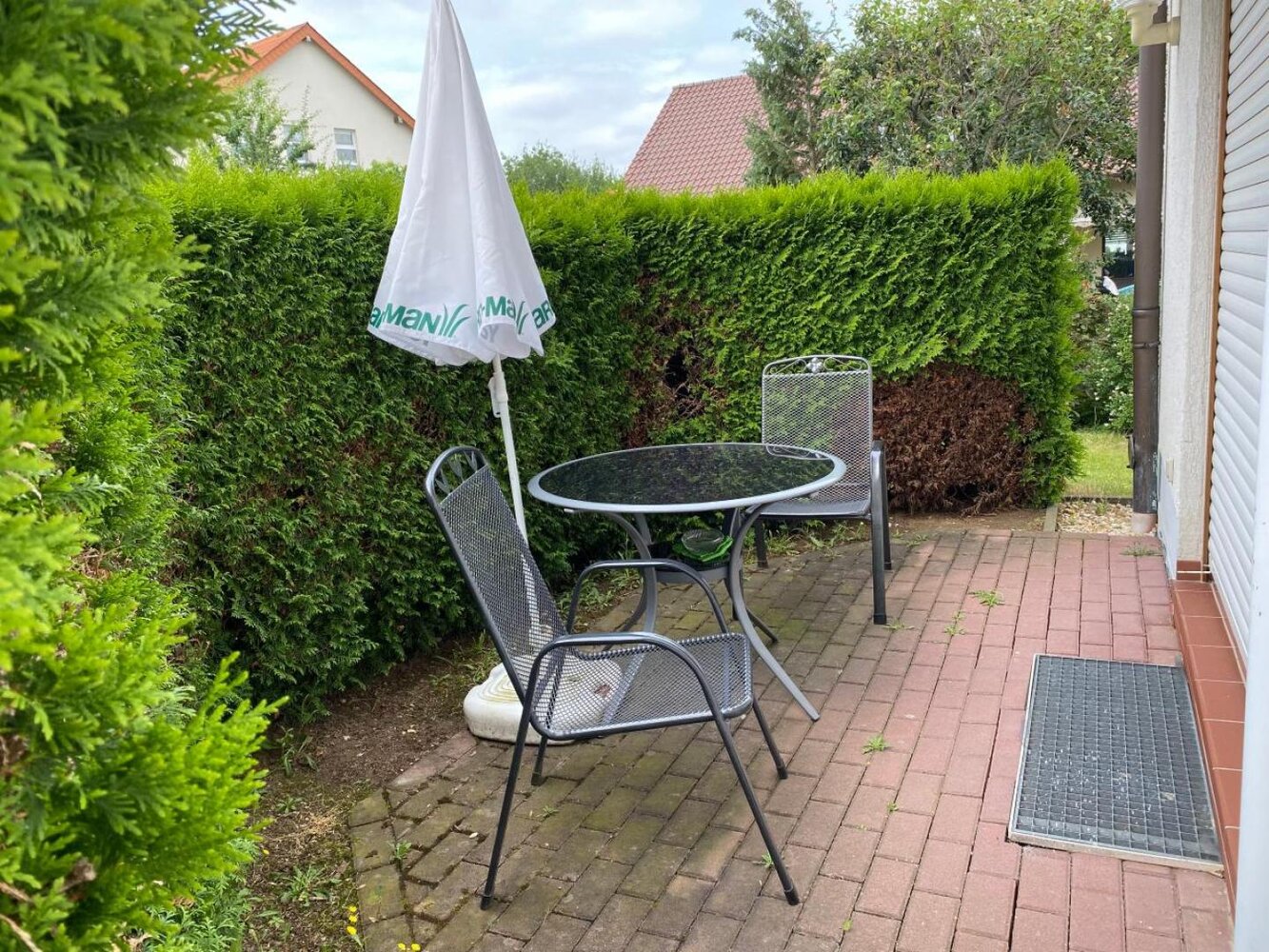 Die Wohnung "Saale" liegt Parterre und eine Terrassentür führt auf eine kleine Terrasse mit Gartengrundstück. Dort stehen zur Erholung Tisch und Stühle mit einem Sonnenschirm zur Verfügung. Bettwäsche und Handtücher sind im Preis enthalten sowie ein Wechsel pro Woche bei längeren Aufenthalten. Ein PKW-Stellplatz steht ihnen vor dem Haus zur Verfügung.