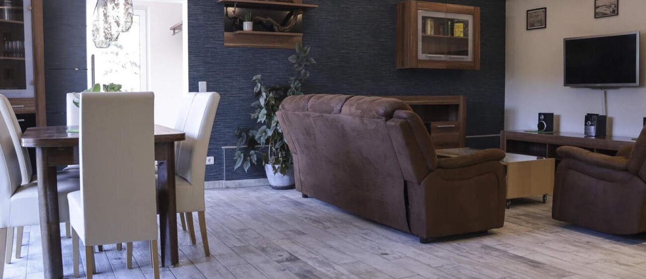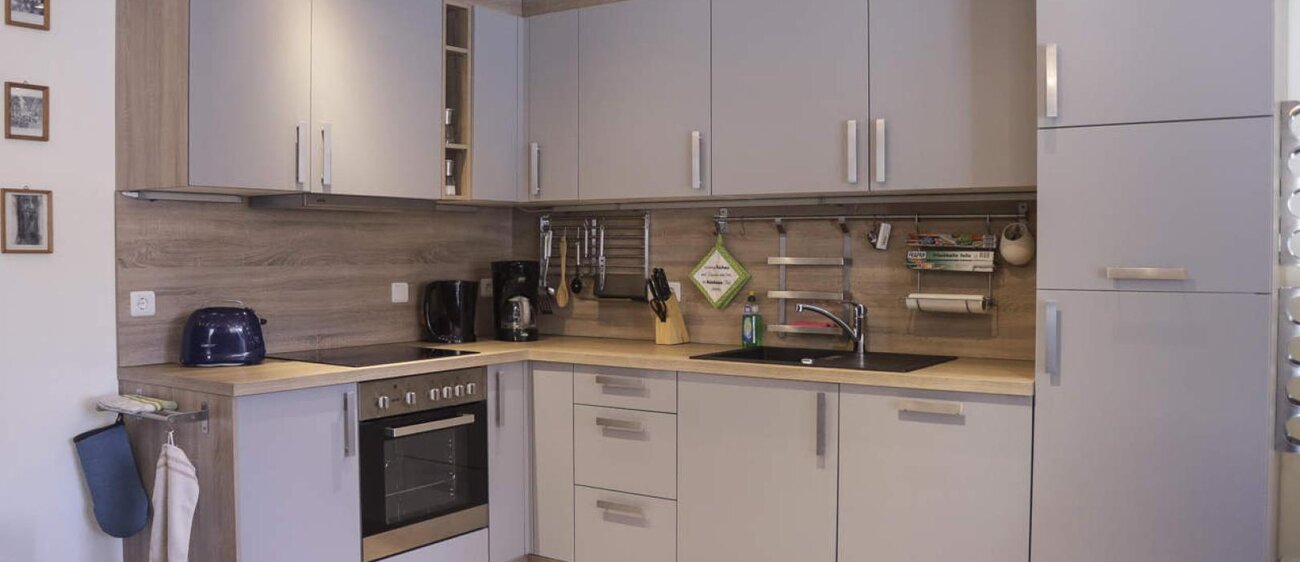 Neben der besonders idyllischen Lage besticht die Ferienwohnung durch ihr angenehmes Raum- und Farbkonzept sowie durch eine moderne Einrichtung. Für wohlige Wärme in den Räumen sorgt eine Fußbodenheizung. Wohnzimmer und Küche sind in einem offenen Wohnbereich vereint mit dem Zugang zur großzügig geschnitten Terrasse.