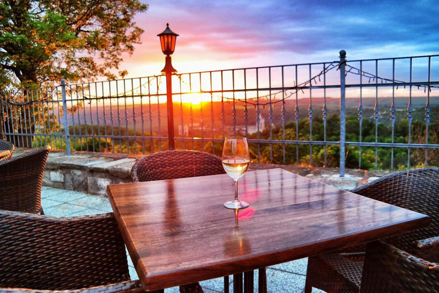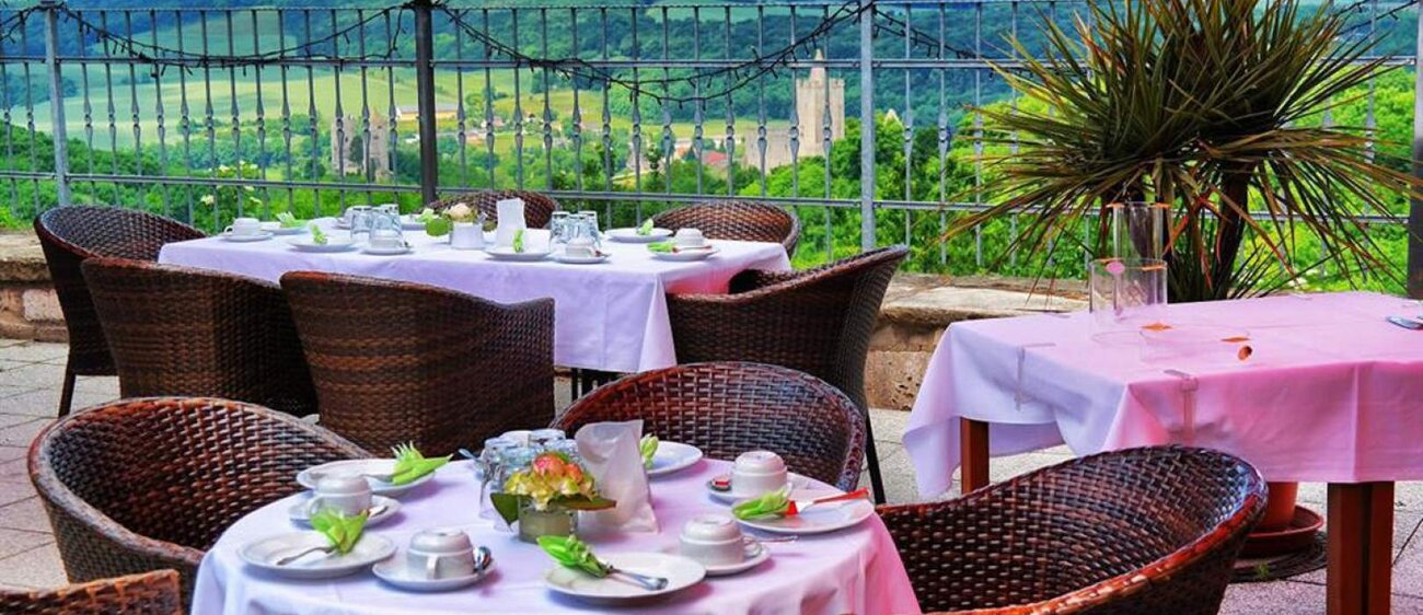 Von einer Anhöhe blickt unser Hotel & Restaurant, mit Sonnenterrasse, auf die Rudelsburg, Burg Saaleck sowie in die reizvolle und geschichtsträchtige Landschaft des Saale- und Ilmtals.