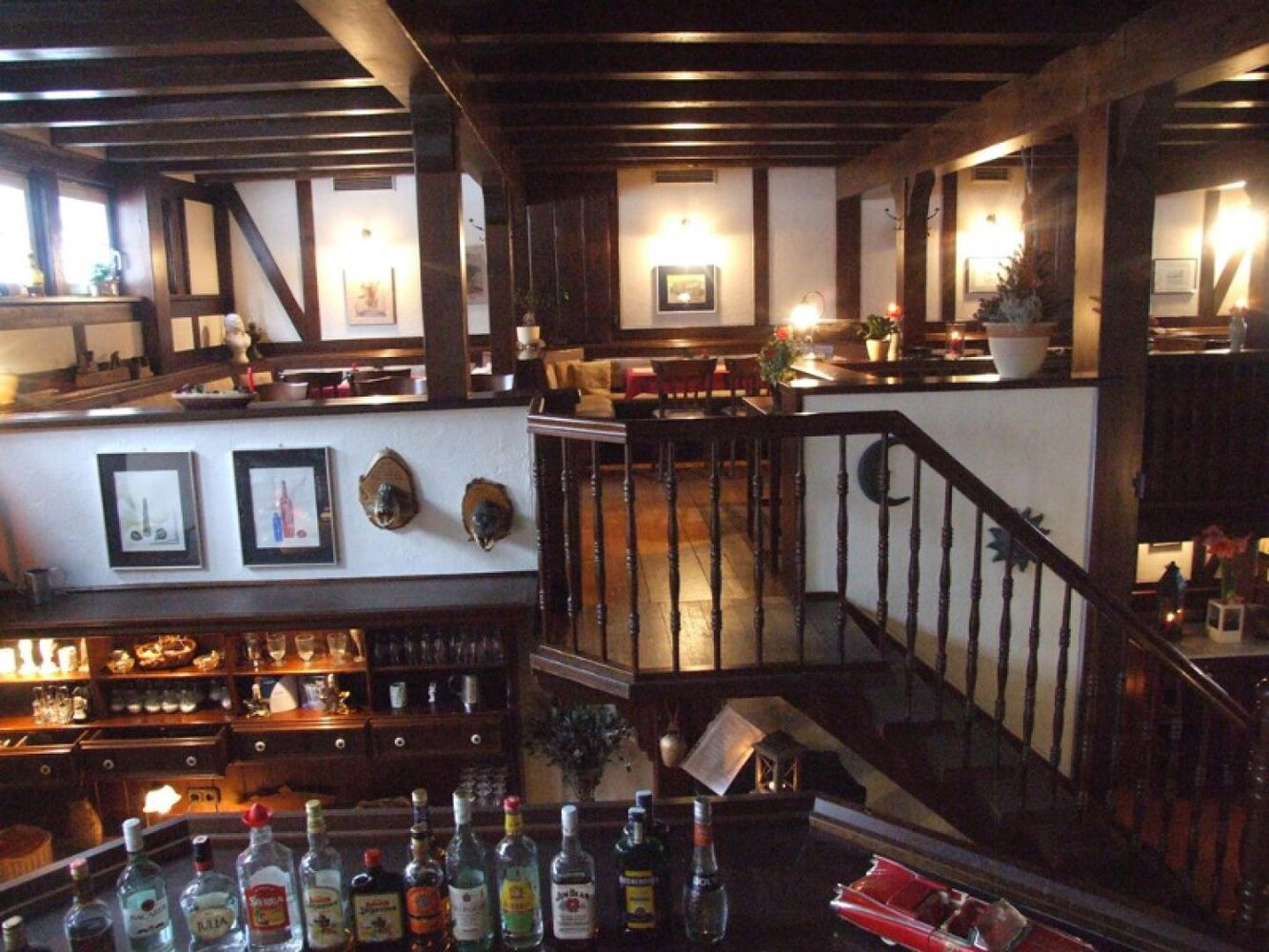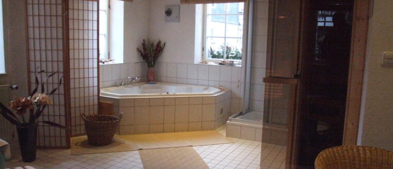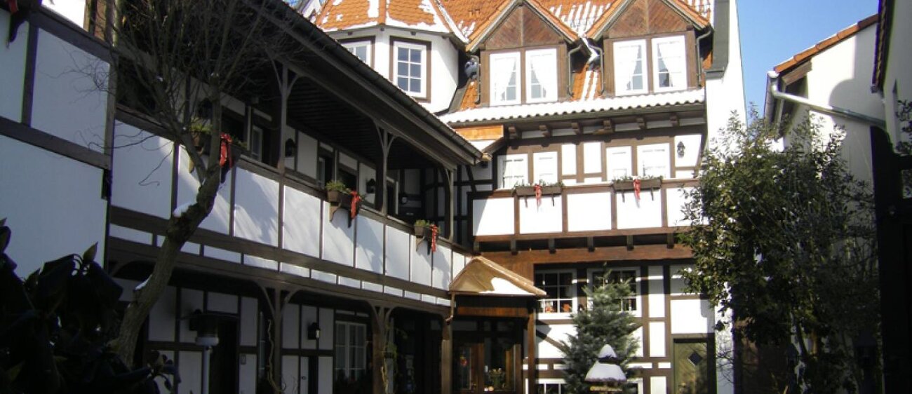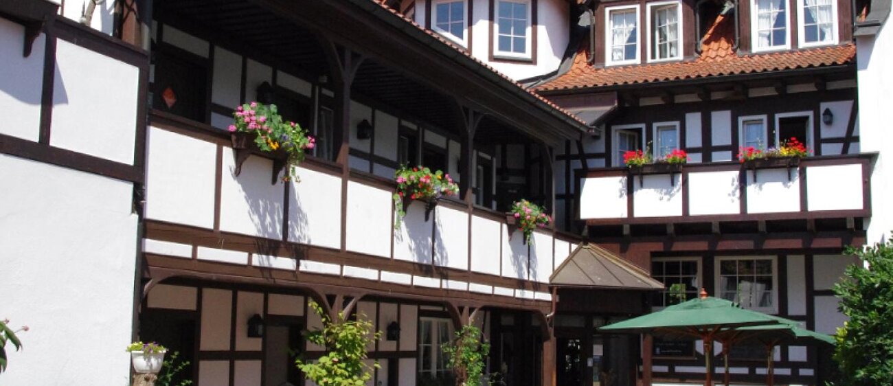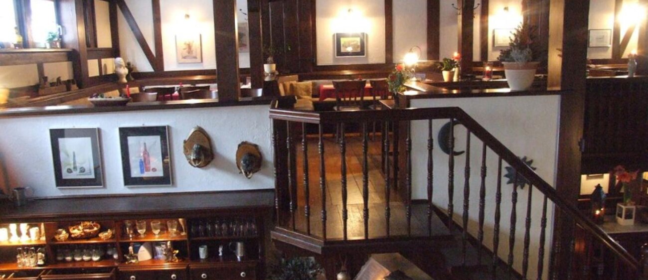 Eingerahmt ist der Innenhof von Stauden, Blumeninseln und Natursteinmauern. Das Fachwerk findet sich auch im Restaurants wieder, inklusive urigem Ambiente aus rustikalen Holzmöbeln und wertvollen Antiquitäten. Nebenan gelangt man zu den im Landhausstil eingerichteten Zimmern mit herrlichen Ausblicken auf Bäume, Wiesen und über die Dächer des kleinen Ortes. In einem Seitentrakt befinden sich Sauna, Whirlpool und Fitnessraum.