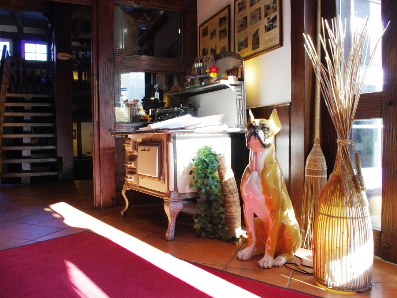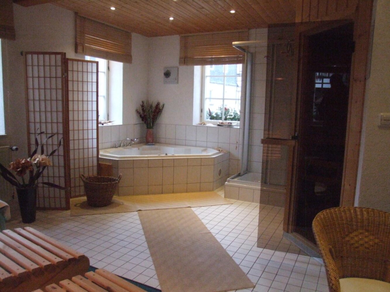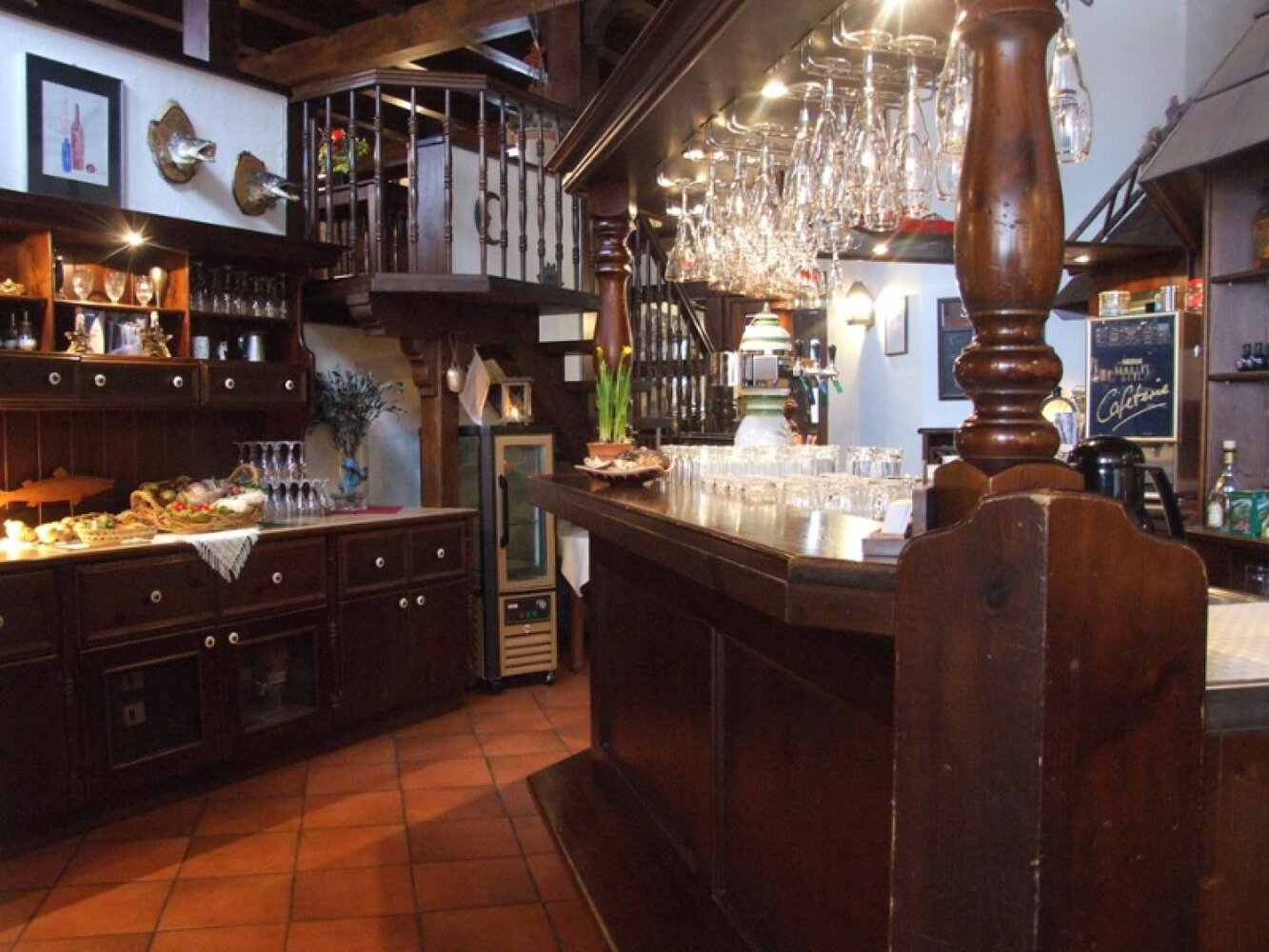 Eingerahmt ist der Innenhof von Stauden, Blumeninseln und Natursteinmauern. Das Fachwerk findet sich auch im Restaurants wieder, inklusive urigem Ambiente aus rustikalen Holzmöbeln und wertvollen Antiquitäten. Nebenan gelangt man zu den im Landhausstil eingerichteten Zimmern mit herrlichen Ausblicken auf Bäume, Wiesen und über die Dächer des kleinen Ortes. In einem Seitentrakt befinden sich Sauna, Whirlpool und Fitnessraum.