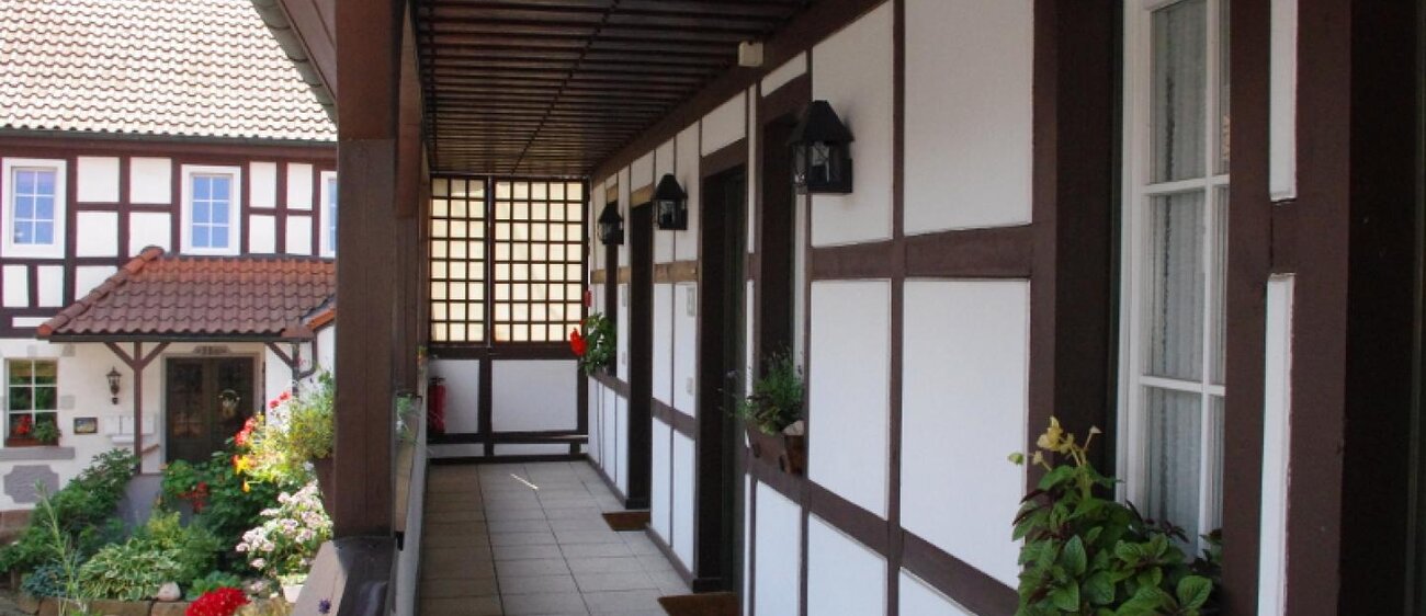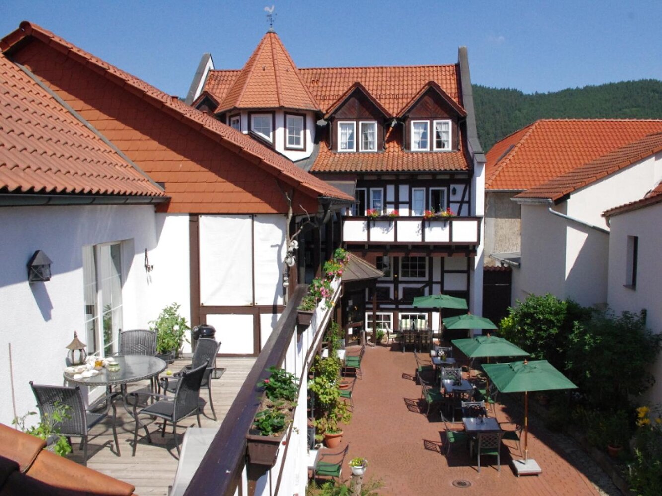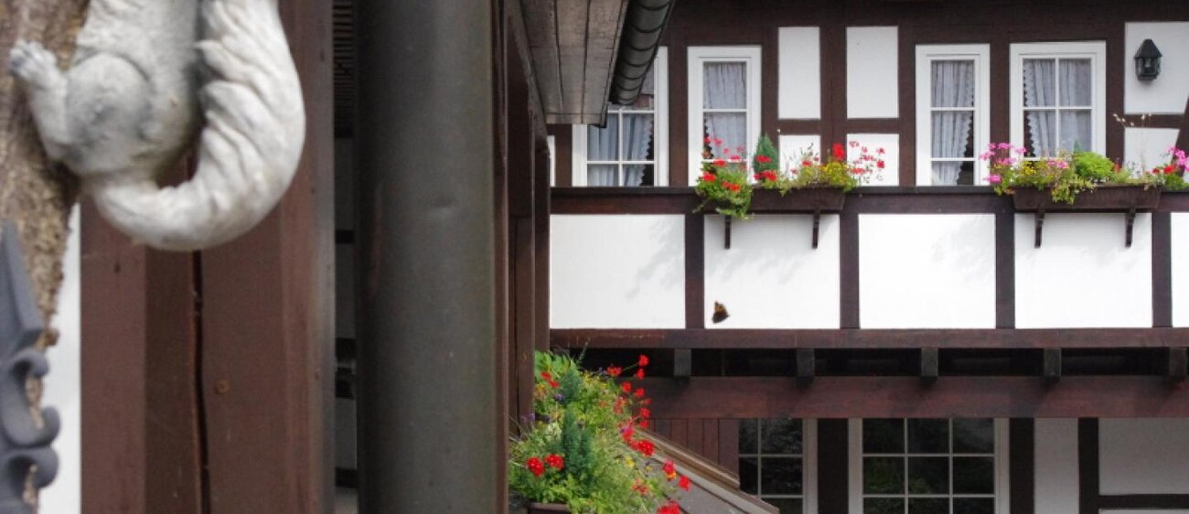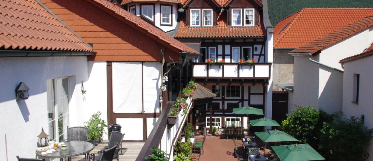 Ein romantischer Innenhof mit Blick auf den Biergarten, auf das historische Fachwerk mit Laubengang und Türmchen auf dem Dach. – Ein verträumtes Urlaubsdomizil im Flair des ländlichen Saaletals: Authentisch. Gemütlich. Genussvoll.