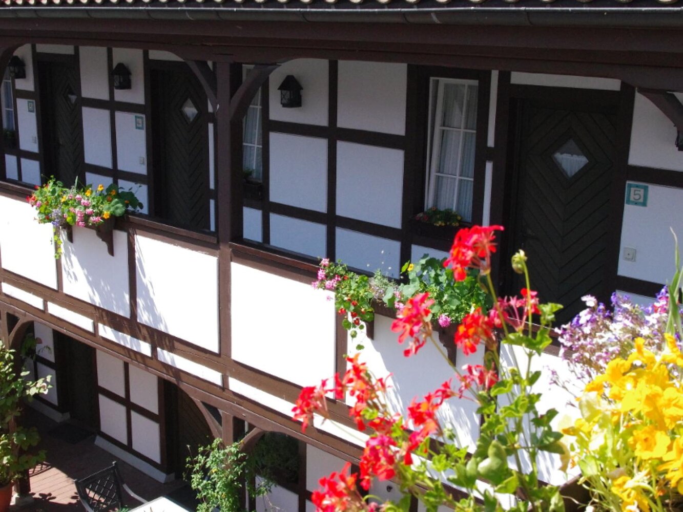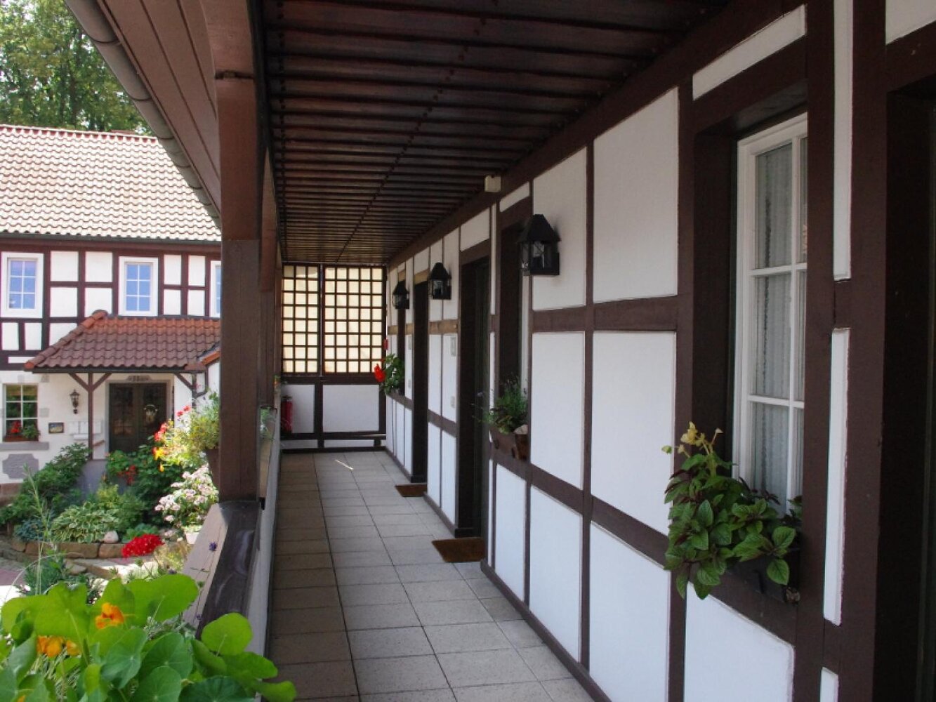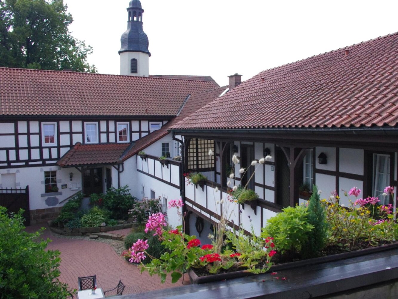 Ein romantischer Innenhof mit Blick auf den Biergarten, auf das historische Fachwerk mit Laubengang und Türmchen auf dem Dach. – Ein verträumtes Urlaubsdomizil im Flair des ländlichen Saaletals: Authentisch. Gemütlich. Genussvoll.