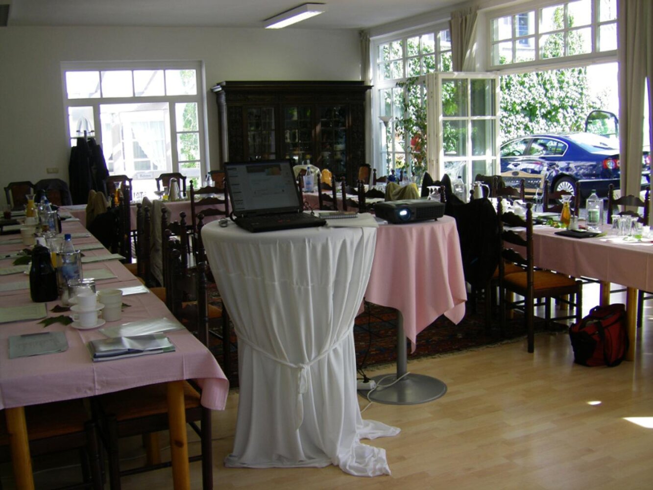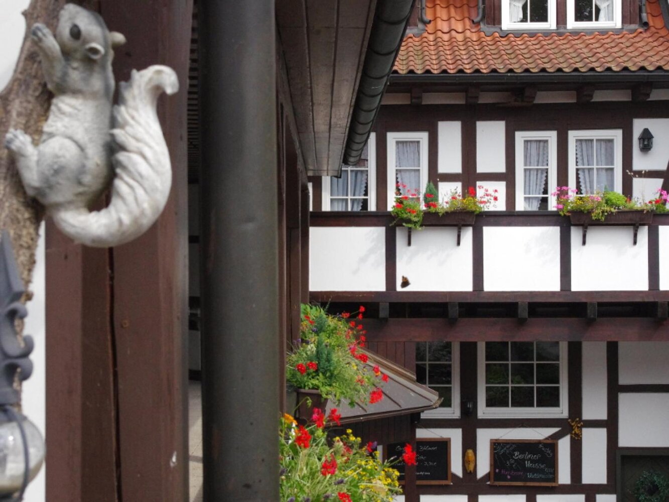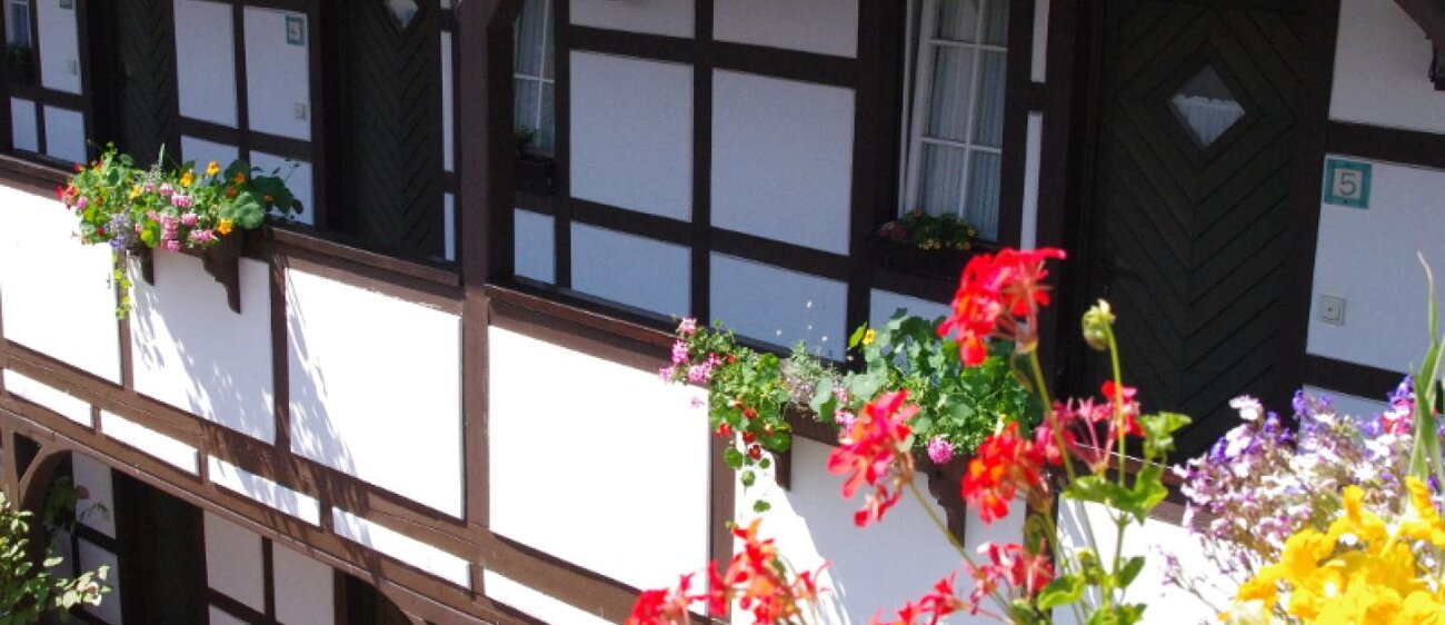 Ein romantischer Innenhof mit Blick auf den Biergarten, auf das historische Fachwerk mit Laubengang und Türmchen auf dem Dach. – Ein verträumtes Urlaubsdomizil im Flair des ländlichen Saaletals: Authentisch. Gemütlich. Genussvoll.