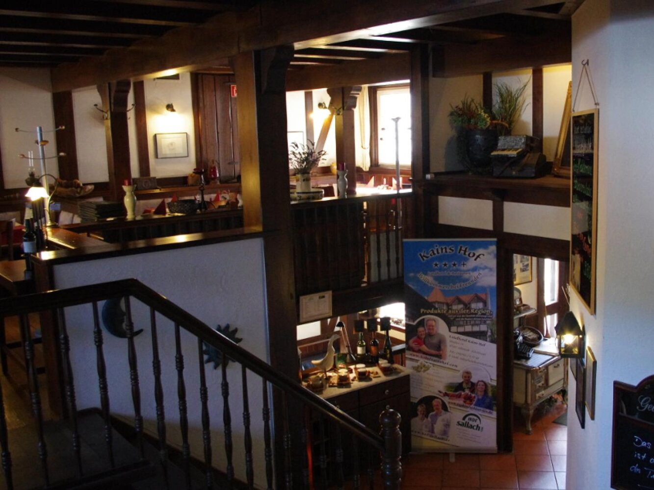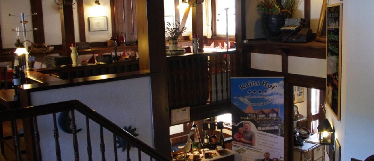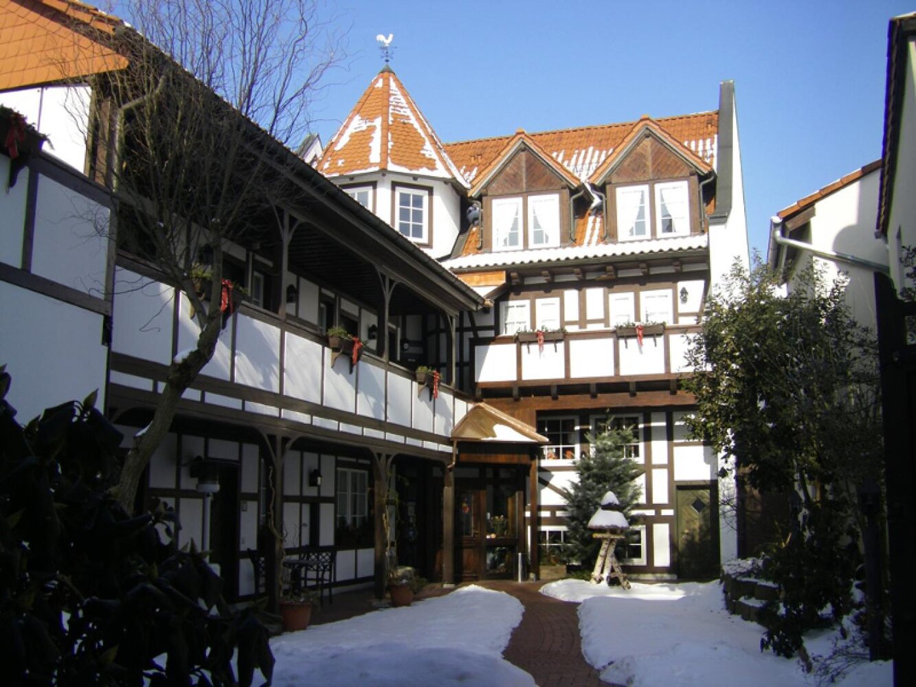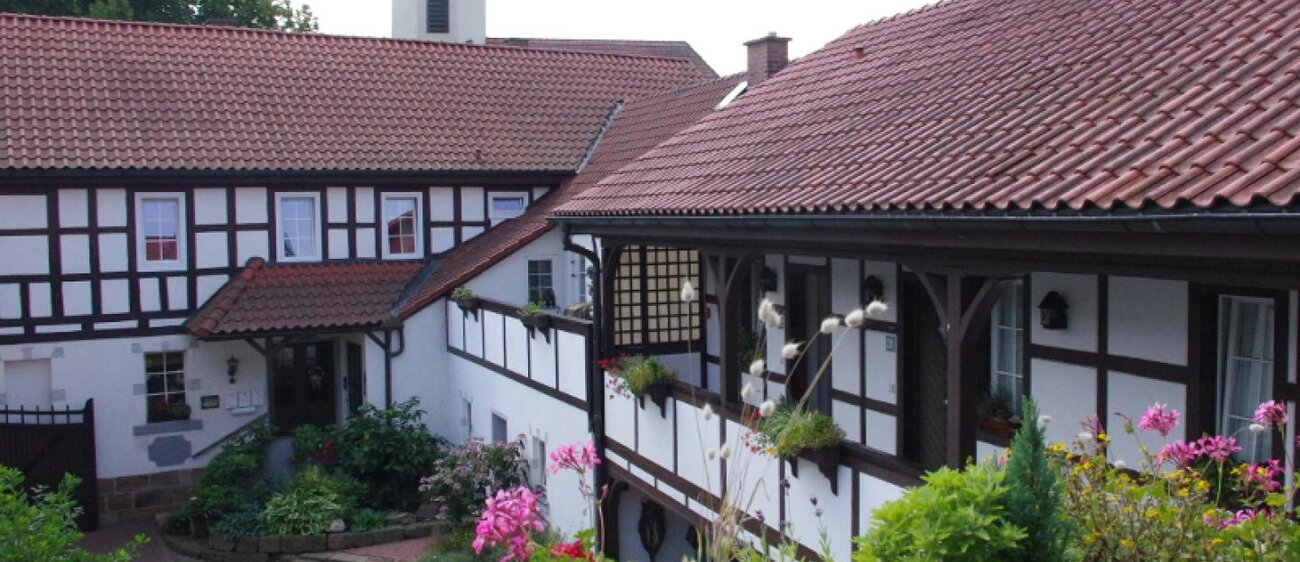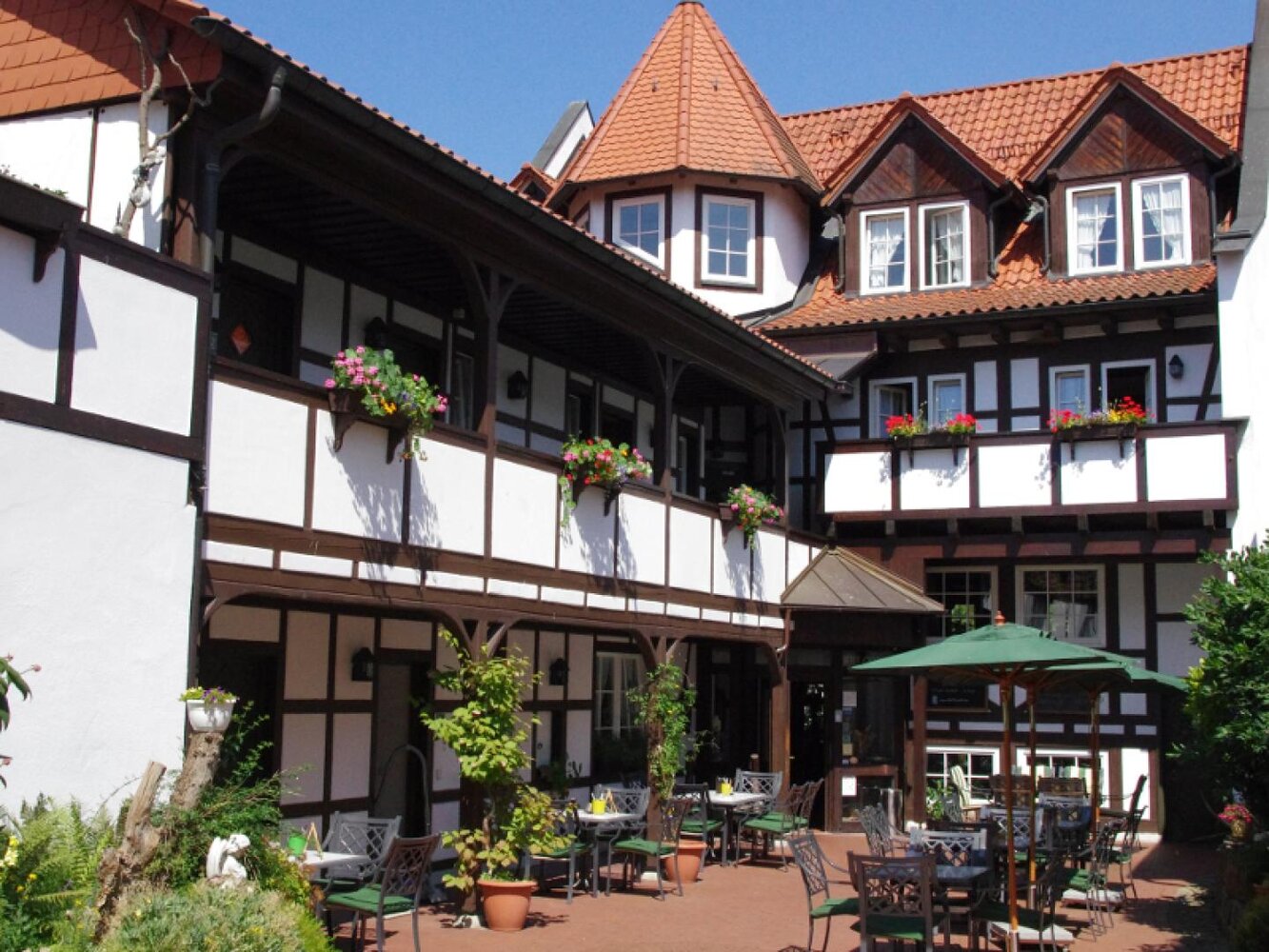 Eingerahmt ist der Innenhof von Stauden, Blumeninseln und Natursteinmauern. Das Fachwerk findet sich auch im Restaurants wieder, inklusive urigem Ambiente aus rustikalen Holzmöbeln und wertvollen Antiquitäten. Nebenan gelangt man zu den im Landhausstil eingerichteten Zimmern mit herrlichen Ausblicken auf Bäume, Wiesen und über die Dächer des kleinen Ortes. In einem Seitentrakt befinden sich Sauna, Whirlpool und Fitnessraum.