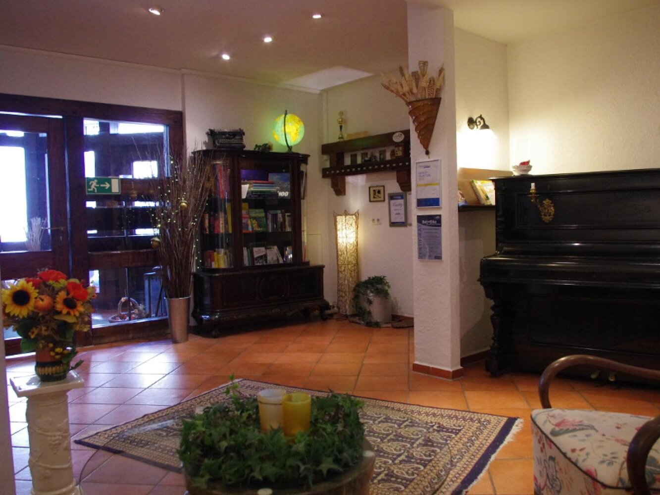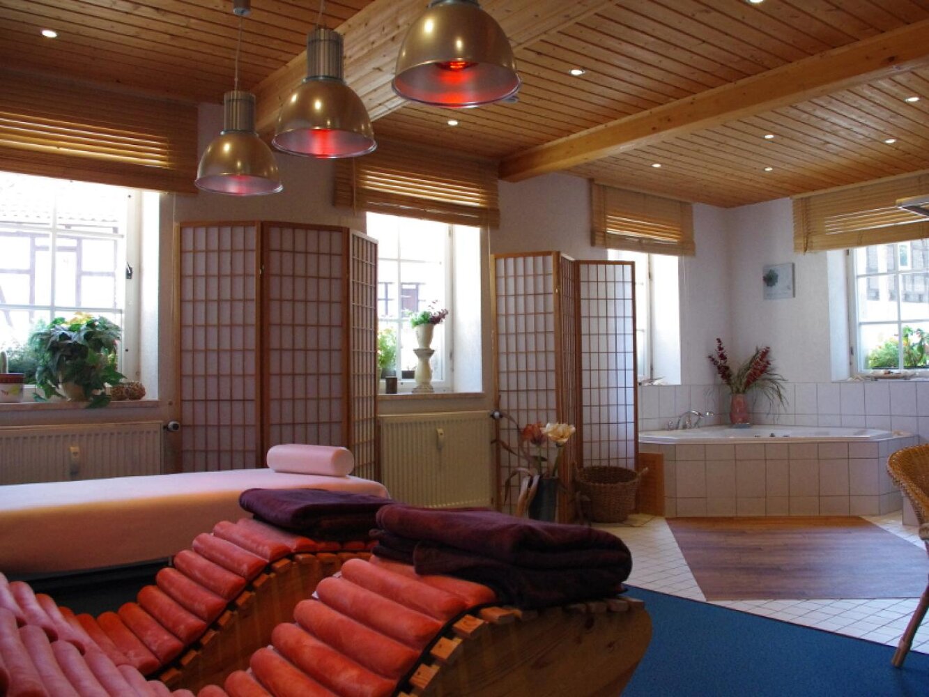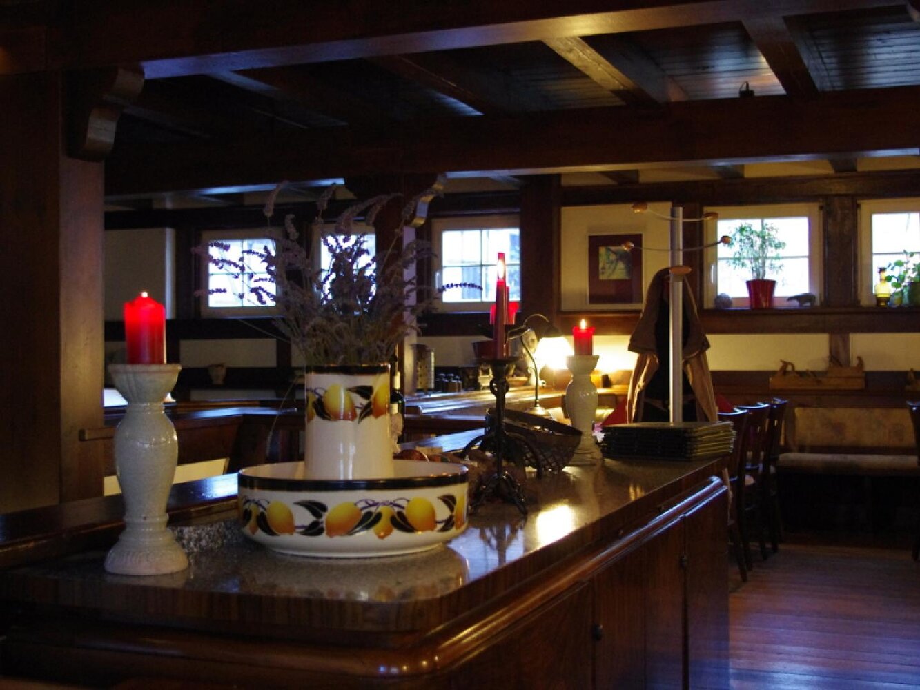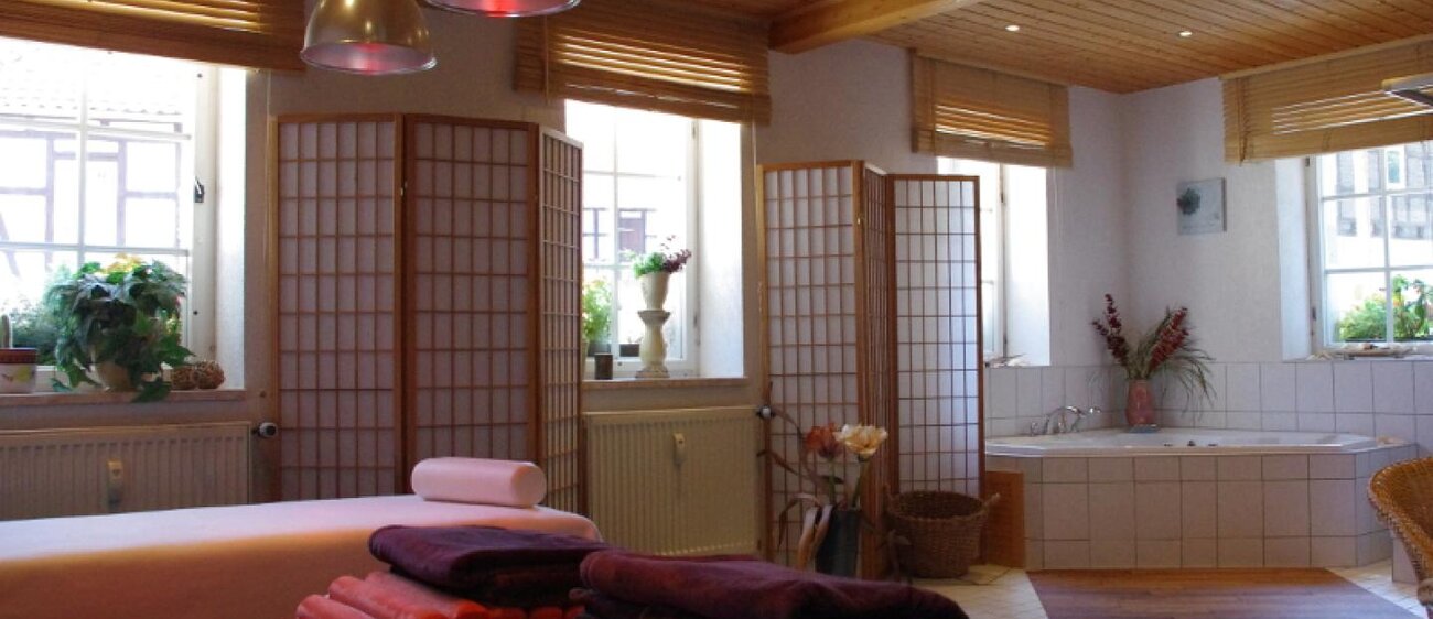 Eingerahmt ist der Innenhof von Stauden, Blumeninseln und Natursteinmauern. Das Fachwerk findet sich auch im Restaurants wieder, inklusive urigem Ambiente aus rustikalen Holzmöbeln und wertvollen Antiquitäten. Nebenan gelangt man zu den im Landhausstil eingerichteten Zimmern mit herrlichen Ausblicken auf Bäume, Wiesen und über die Dächer des kleinen Ortes. In einem Seitentrakt befinden sich Sauna, Whirlpool und Fitnessraum.