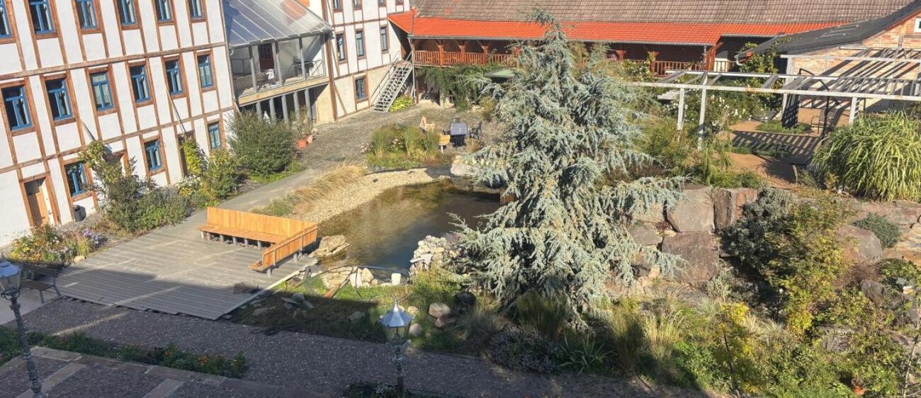 Eingebettet in die sanfte Landschaft östlich der Saale, liegt Wölkau idyllisch zwischen Leuna und Bad Dürrenberg. Der Ort besticht durch seine ländliche Ruhe und eine der ältesten Dorfkirchen der Region, die nach liebevoller Sanierung wieder für Besucher geöffnet ist. Wölkau ist der perfekte Ausgangspunkt, um die kulturreiche und naturnahe Umgebung zu entdecken. Ob als Ausflugs- oder Etappenziel für Radfahrer entlang der Saale oder als Ausgangsbasis für Erkundungen der Region zwischen Leuna und Bad Dürrenberg – der Hof in Wölkau heißt Gäste herzlich willkommen. Liebevoll gestaltet mit großzügigem Freigelände, einem Biotop, sonnigen Terrassen sowie einer Bar mit Imbissangebot lädt er zum Verweilen ein. Für Familien gibt es einen Spielplatz, und ab und an bereichert ein kleines Kulturprogramm das Hofleben mit Veranstaltungen unter freiem Himmel. Der Hof bietet Platz auch für große Gruppen. | Waschmaschine und Trockner stehen ebenfalls zur Verfügung.
