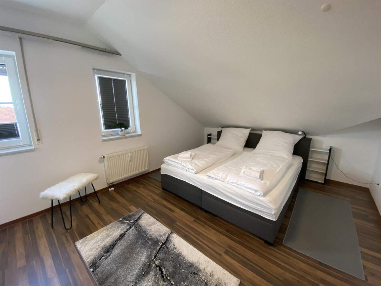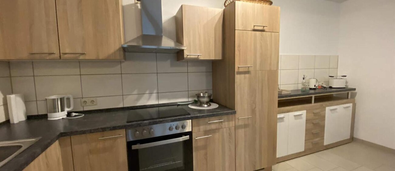 Ruhige Lage im Stadtzentrum, Nähe Geiseltalsee, 2. Etage, barrierefreier Zugang, Flur mit Kleiderschrank, offene Küche, Schlafzimmer mit Boxspring-Doppelbett, Wohnzimmer mit Schlafcouch (1,60 m Liegefläche), Fenster mit Außenjalousien, Bad/WC mit großer Dusche und Fön, Böden: Laminat/Fliesen