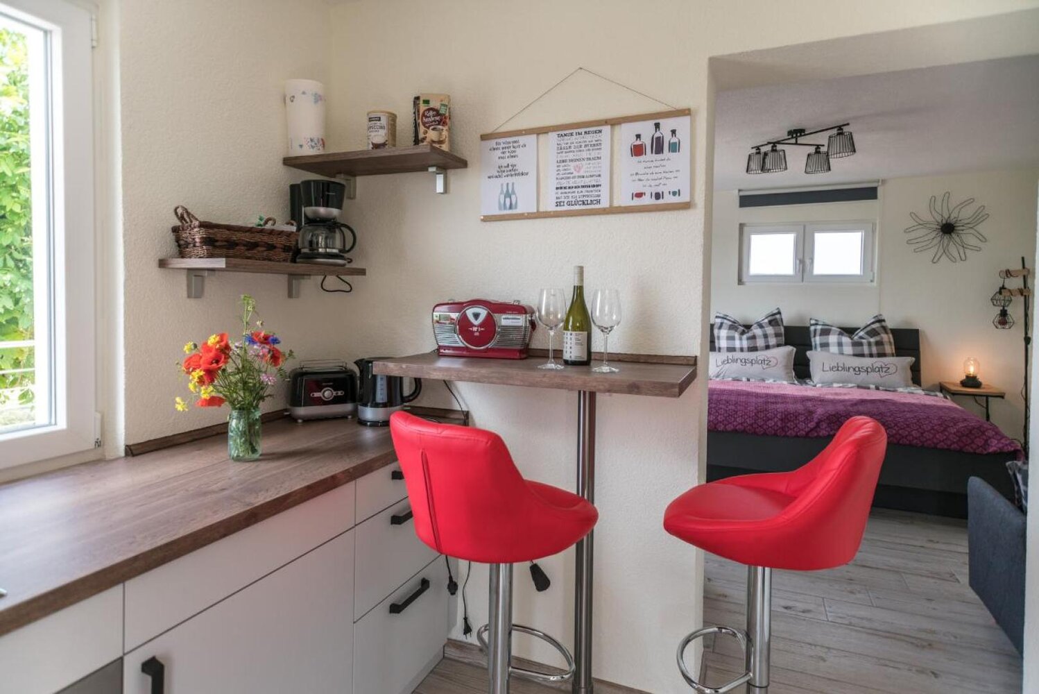 Die Weinbergshütte im Toskana Stil verfügt über einen kombinierten Wohn-Schlafbereich mit großem Bett, einer kleinen gemütlichen Sitzecke mit Sofa und TV, einer voll ausgestatteten Küche sowie einem kleinen Bad. Die große Terrasse mit traumhaftem Ausblick ins Saale-Unstrut Tal lädt zum romantischen Entspannen ein und bietet den gleichen imposanten, unvergleichlich schönen Blick.