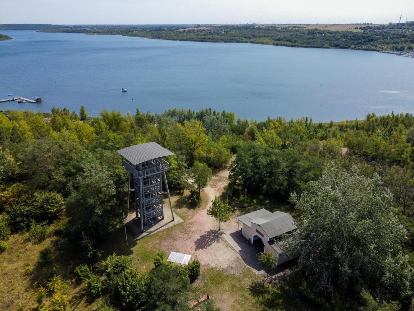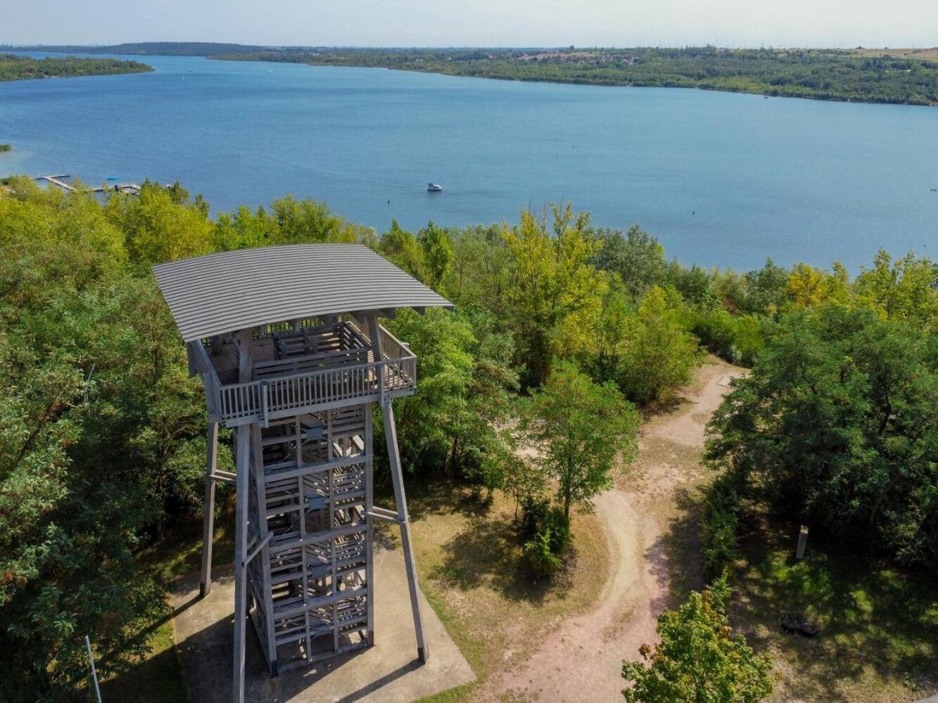 Zwischen dem Ort Stöbnitz und dem Geiseltalsee Camp steht auf einer Anhöhe oberhalb des Wassers der Aussichtsturm „Pauline“. Der Turm ist aus Holz gebaut und rund 15 Meter hoch. Über Treppen lässt sich die Aussichtsplattform erklimmen, von der du einen tollen Blick über die Geiseltalsee hast. So kannst du dir einen ersten Überblick verschaffen – vom Camp mit Strand, über die Halbinsel bis zur Marina Mücheln, wo Boote auf den nächsten Ausflug warten.