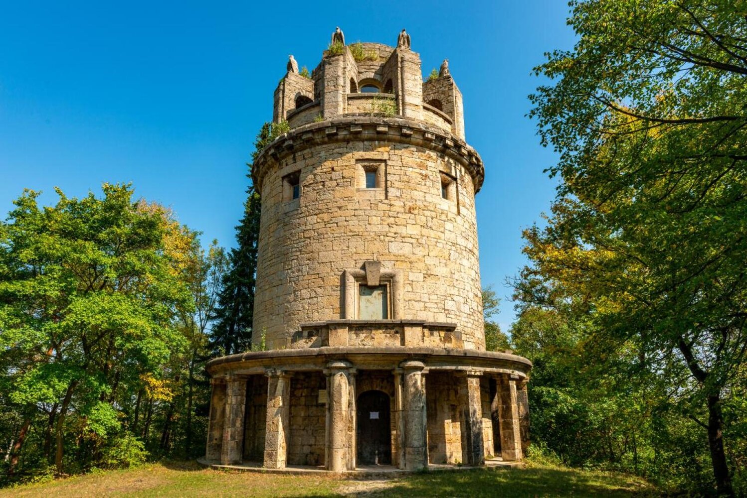 Der Bismarckturm in Jena ist ein markantes Denkmal auf dem 328 Meter hohen Tatzend im Jenaer Forst. Er wurde zwischen 1906 und 1909 errichtet und am 5. Juli 1909 feierlich eingeweiht. Der Turm entstand auf Initiative der Jenaer Studentenschaft, unterstützt von Persönlichkeiten wie dem Zoologen Ernst Haeckel und dem Verleger Gustav Neuenhahn. Finanziert wurde das Bauwerk durch Spenden von Studenten, Bürgern und Vereinen. Der renommierte Architekt Wilhelm Kreis entwarf den 21 Meter hohen Rundturm aus Kalksteinquadern, der sich durch seine monumentale Architektur und die steinernen Adler des Jenaer Bildhauers Otto Späte auszeichnet.