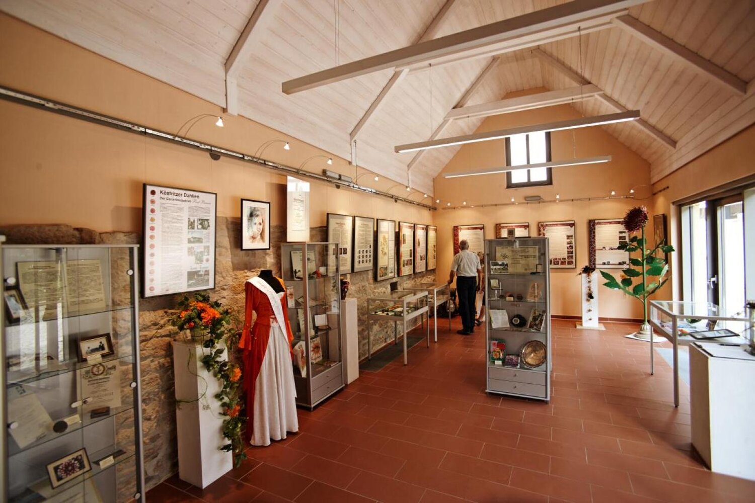 Einzigartig in Deutschland sind im Schaugarten auf ca. 400 m² Fläche seltene Naturarten, ca. 80 wertvolle historische Sorten seit 1879 sowie Neuzüchtungen von Köstritzer Dahlien zu sehen. Auf 8 großen Info-Tafeln werden anschaulich Botanik und gärtnerische Informationen dargestellt, wodurch der interessierte Besucher hier viel Wissenswertes über diese Tradition erfährt.