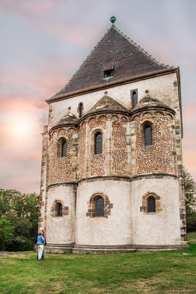 Wie ein romanischer Wohnturm thront die Doppelkapelle "Sanctae Crucis" heute einsam über Landsberg.