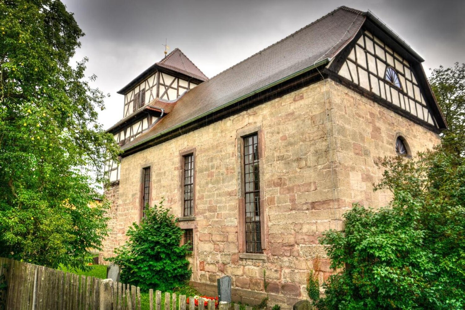 Die kleine Kirche steht unmittelbar an der Brücke, die die beiden Saaleufer in der Aue überbrückt. Die schlichte Filialkirche mit Langhaus, kleinem Turm und quadratischem Chor stammt aus frühgotischer Zeit. 1689 erhöhte man den Turm um die zwei Fachwerkgeschosse. Der Glockenstuhl wurde zurückgesetzt.