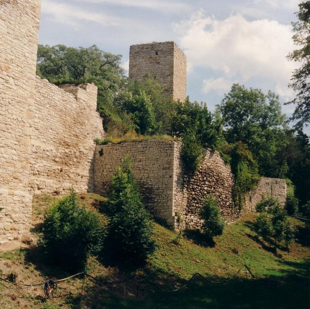 Der Jungfernturm an der Südseite dieser früheren Räume hat Fenster sowie Pechnasen zur Verteidigung. Prunkstück der Burg ist der 36 m hohe große Bergfried, der als Wachturm und als Unterkunft diente. Er besitzt 5 Geschosse, von denen das erste mit Schutt ausgefüllt ist. Die Mauerdicke beträgt bis zum 3. Stockwerk 2,5 m, danach ca. 1,5 m, sodass ein Wehrgang von 1 m vorhanden ist.