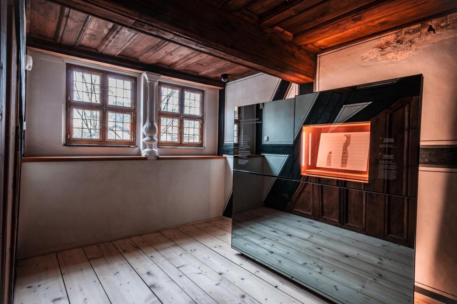 Die Ausstellung macht das Leben und Schaffen des Komponisten auf drei Etagen erlebbar. Den Höhepunkt bildet die wiederhergestellte Komponierstube, in der Schütz sein Alterswerk schuf. Als wertvollster Schatz werden hier zwei im Hausaufgefundene Notenfragmente von der Hand des Komponisten präsentiert.
