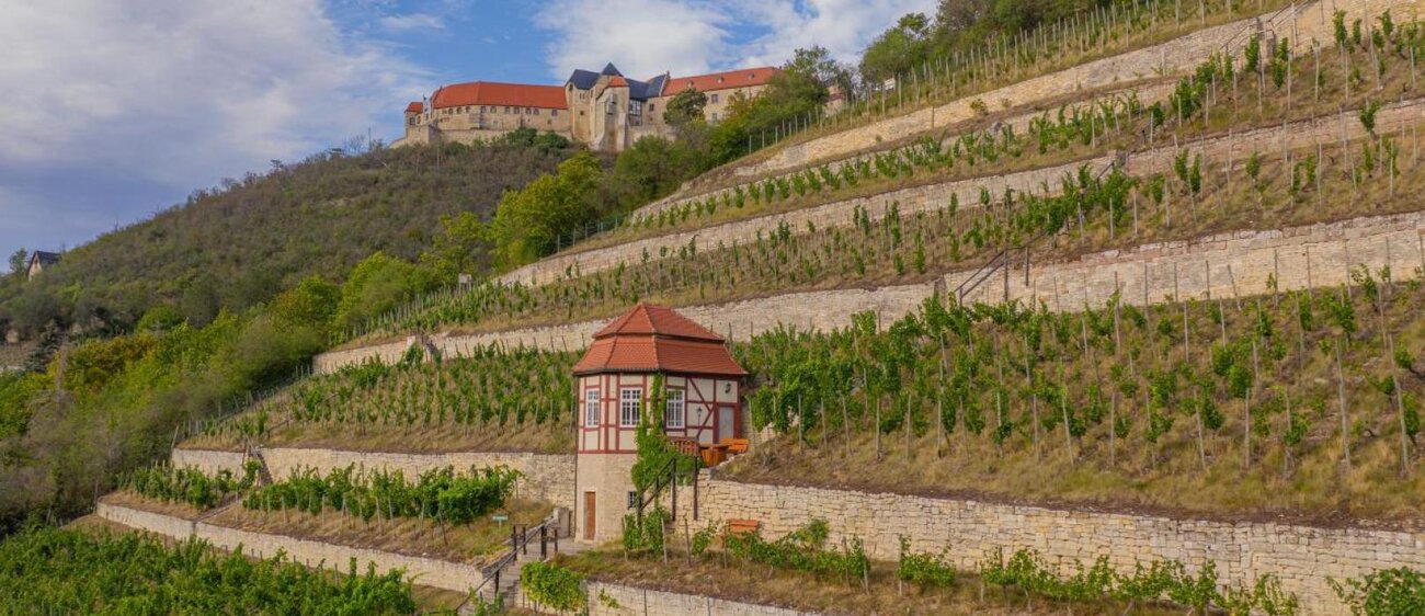 Der Herzogliche Weinberg, gut zu erkennen an dem hübschen kleinen Fachwerkhäuschen etwa auf halber Höhe, steht symbolisch für Freyburg an der Unstrut, ebenso wie Schloss Neuenburg, das über der Stadt thront. Beim Weinberg handelt es sich um einen sogenannten Terrassenweinberg, dessen Ursprünge ins 18. Jahrhundert zurückreichen. Angelegt wurde er 1774 von Carl Gottlieb Barthel, seines Zeichens kursächsischer Steuerbeamter. Den barocken Weingarten und das Häuschen mit seiner Innenausstattung im Rokoko-Stil kannst du besichtigen.