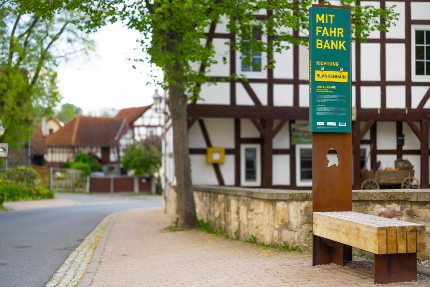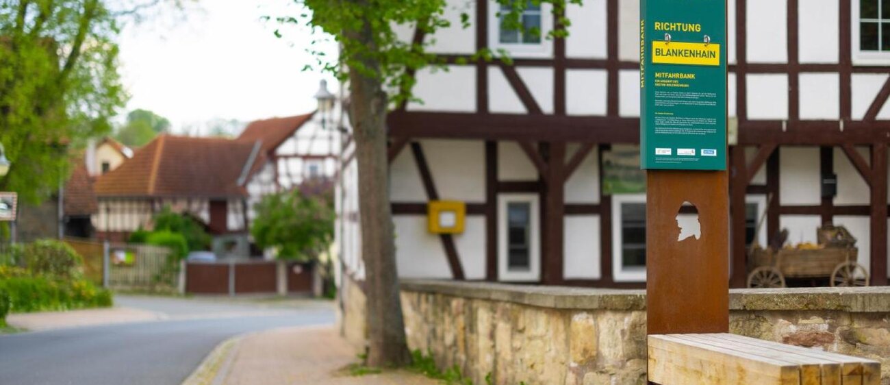 Keine Kutsche, wie zu Goethes Zeiten in Sicht? Die Mitfahrbank ist ein besonderes Angebot am Goethe-Erlebnisweg. Sie ermöglicht es, von Großkochberg zurück zum Ausgangspunkt der Wanderung zu gelangen. Nutze die Klappschilder, um die gewünschte Fahrtrichtung anzuzeigen.