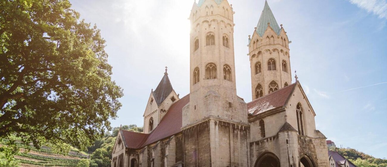 Die Kirche St. Marien prägt das Freyburger Stadtbild vor allem durch ihre drei Türme. Vor allem das Turmpaar im Westen kommt dir vielleicht bekannt vor? Kein Wunder, denn deren Stil orientiert sich an den Osttürmen des Naumburger Doms. Daher wird die Freyburger Stadtkirche manchmal auch die „kleine Schwester“ des Doms genannt. Das Westportal ist durch eine Vorhalle mit Kreuzgewölbe geschützt; über dem Säulenportal befindet sich ein Tympanon im romanischen Rundbogenstil mit einer christlichen Darstellung.