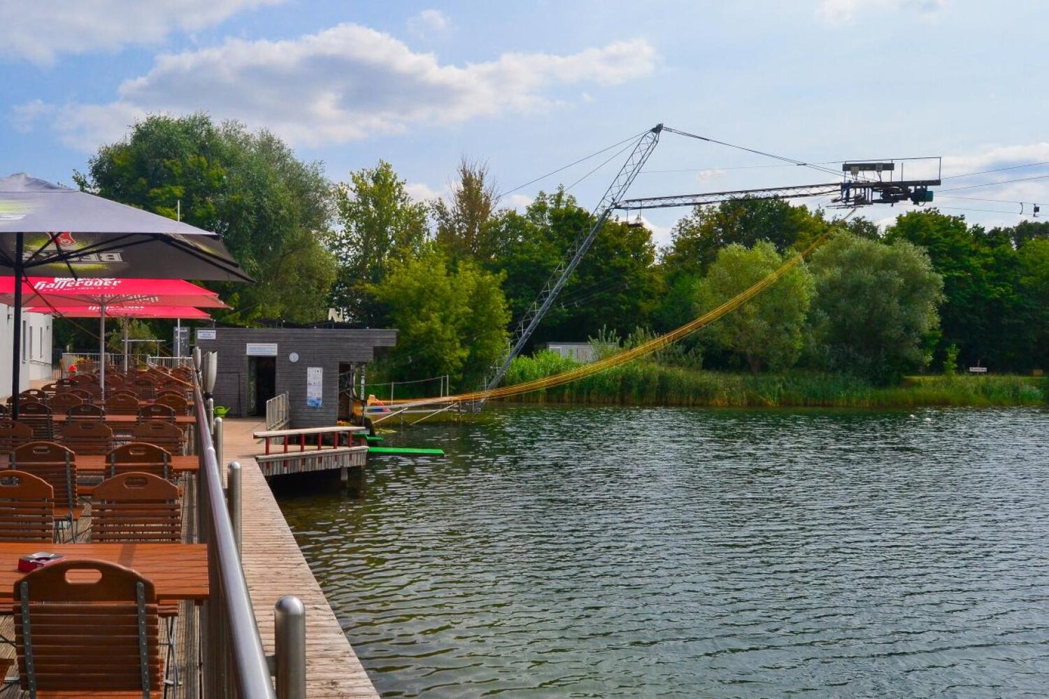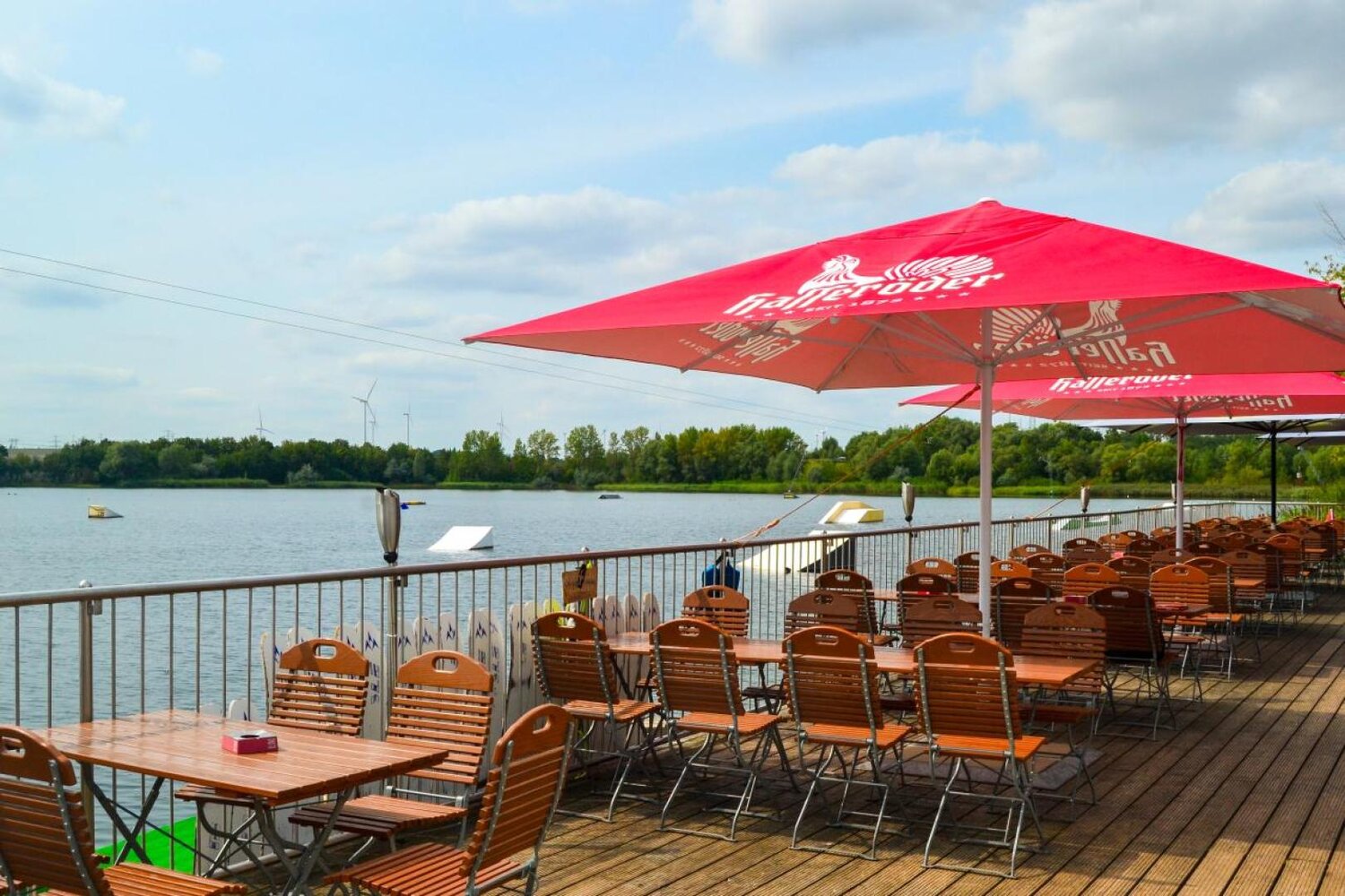 Wer eine oder mehrere Runden übers Wasser gesaust ist, hat sich auf jeden Fall eine Pause verdient. Die kannst du auf der großzügigen Terrasse der Wasserski-Anlage verbringen. Hier gibt es Speisen und Getränke, um wieder Kraft zu tanken. Natürlich kannst du die Terrasse oder den See auch einfach so besuchen, ohne Wasserski oder Wakeboard zu fahren. Manchmal ist Zuschauen genauso spannend! Wer sich dann doch traut, kann jederzeit Equipment ausleihen und sich in die Fluten stürzen.