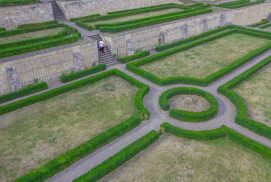 Verpassen sollten Sie auch nicht das Herz- und außergewöhnliche Schmuckstück des Parks: das Blumentheater. Beete, Blumen und Buchsbaum ergeben formvollendete Motive, die in ihrer Farbgebung dem Farbkreis Goethes folgen. Wenn Sie die Blumentreppe zum Leinwandhäuschen hinauflaufen, haben Sie den besten Blick zurück auf das Farbenspiel der Natur.