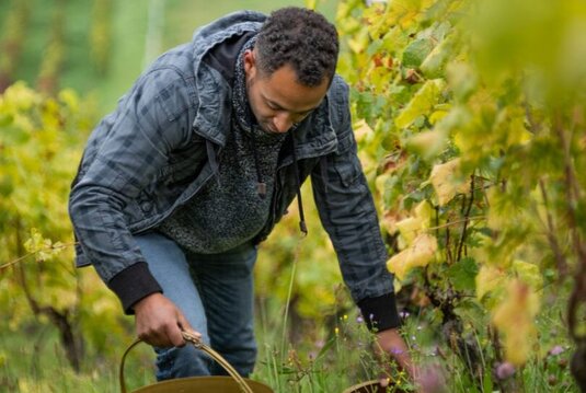 Ernte-Helfende ziehen gemeinsam entlang der Rebstöcke durch den Weinberg. Sie schneiden von Hand die Trauben ab. Dabei erfolgt ein erster Qualitäts-Check: Wenn Trauben beschädigt, schimmlig oder vertrocknet sind, müssen sie direkt aussortiert werden. Und ab geht es in den Eimer und von dort aus in einen weiteren Sammelbehälter. Der Vorteil an der Handlese: Die Trauben werden so ganz schonend gelesen und kaum beschädigt.