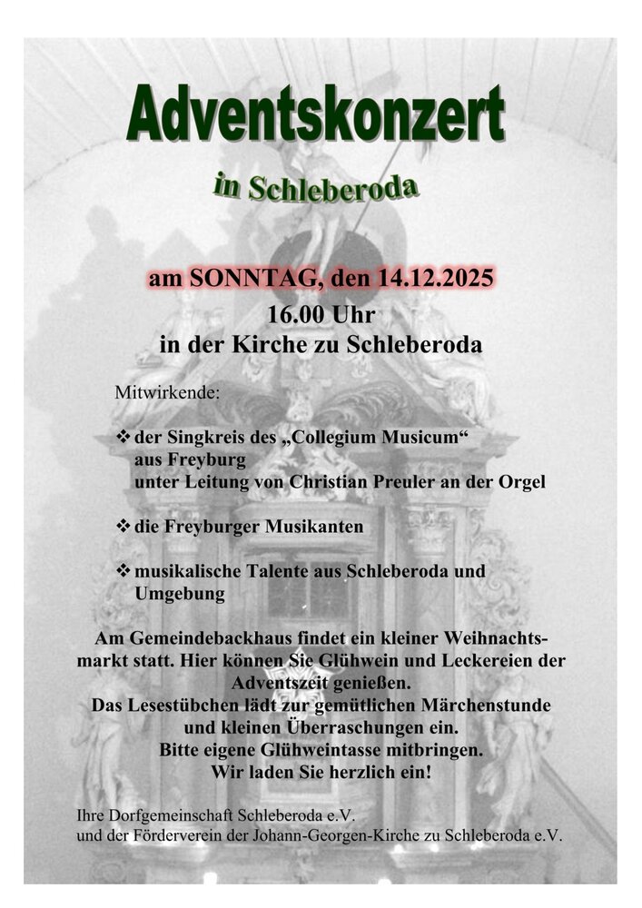 Adventskonzert in Schleberoda am Sonntag, den 14.12.2025 ab 16.00 Uhr in der Kirche zu Schleberoda.