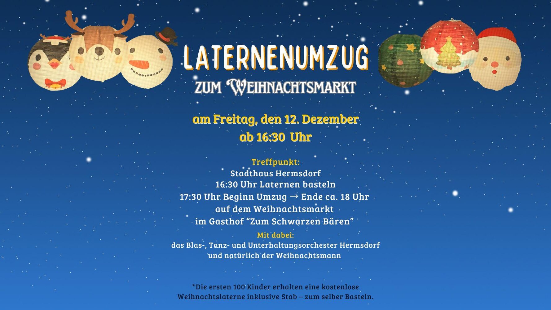 Am 12. Dezember beginnt der Fackelumzug am Stadthaus Hermsdorf um 16:30 Uhr mit dem Basteln von Laternen. Die ersten 100 Kinder erhalten eine kostenlose Laterne inklusive Stab zum Selberbasteln. Um 17:30 Uhr startet der Umzug, der etwa um 18:00 Uhr auf dem Weihnachtsmarkt im Gasthof „Zum Schwarzen Bären“ endet. Für festliche Stimmung sorgen das Blas-, Tanz- und Unterhaltungsorchester Hermsdorf und natürlich der Weihnachtsmann.