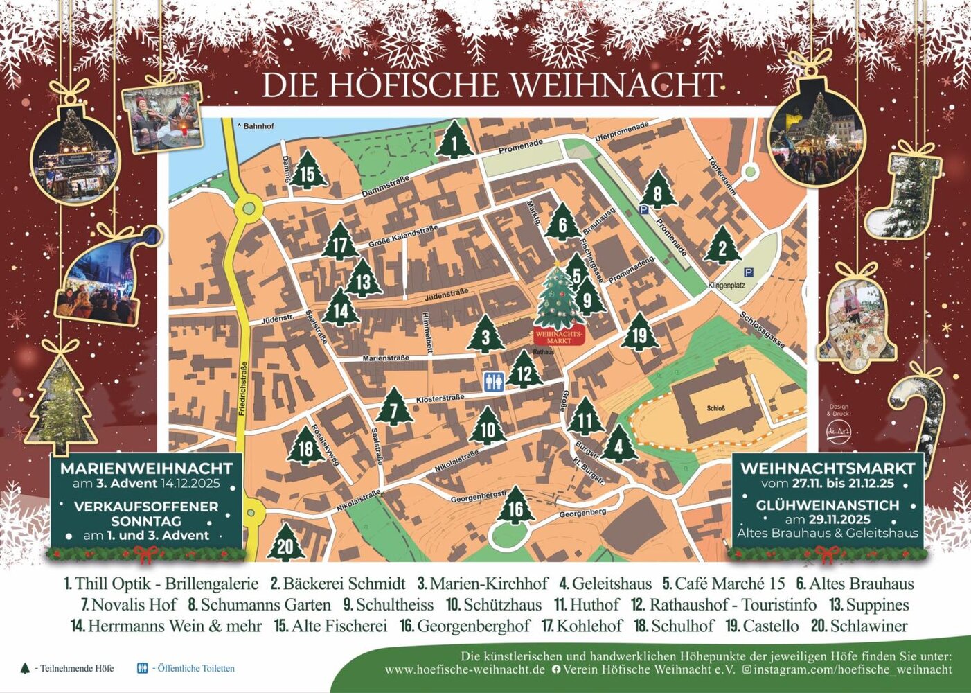 Die Höfische Weihnacht ist fester Bestandteil des Weißenfelser Veranstaltungskalenders und lockt tausende Neugierige in die Saalestadt. In heimeliger Atmosphäre erkunden die Gäste die Hinterhöfe, die liebevoll geschmückt sind und für die Besucher Glühwein, Leckereien und andere Überraschungen bereithalten. Köstlichkeiten gibt es auch im Alten Brauhaus. Bei Winzerglühwein, Heißer Schokolade, heißem Apfelpunsch, Langos und Kraut-Hack-Pfanne fällt die Auswahl schwer.