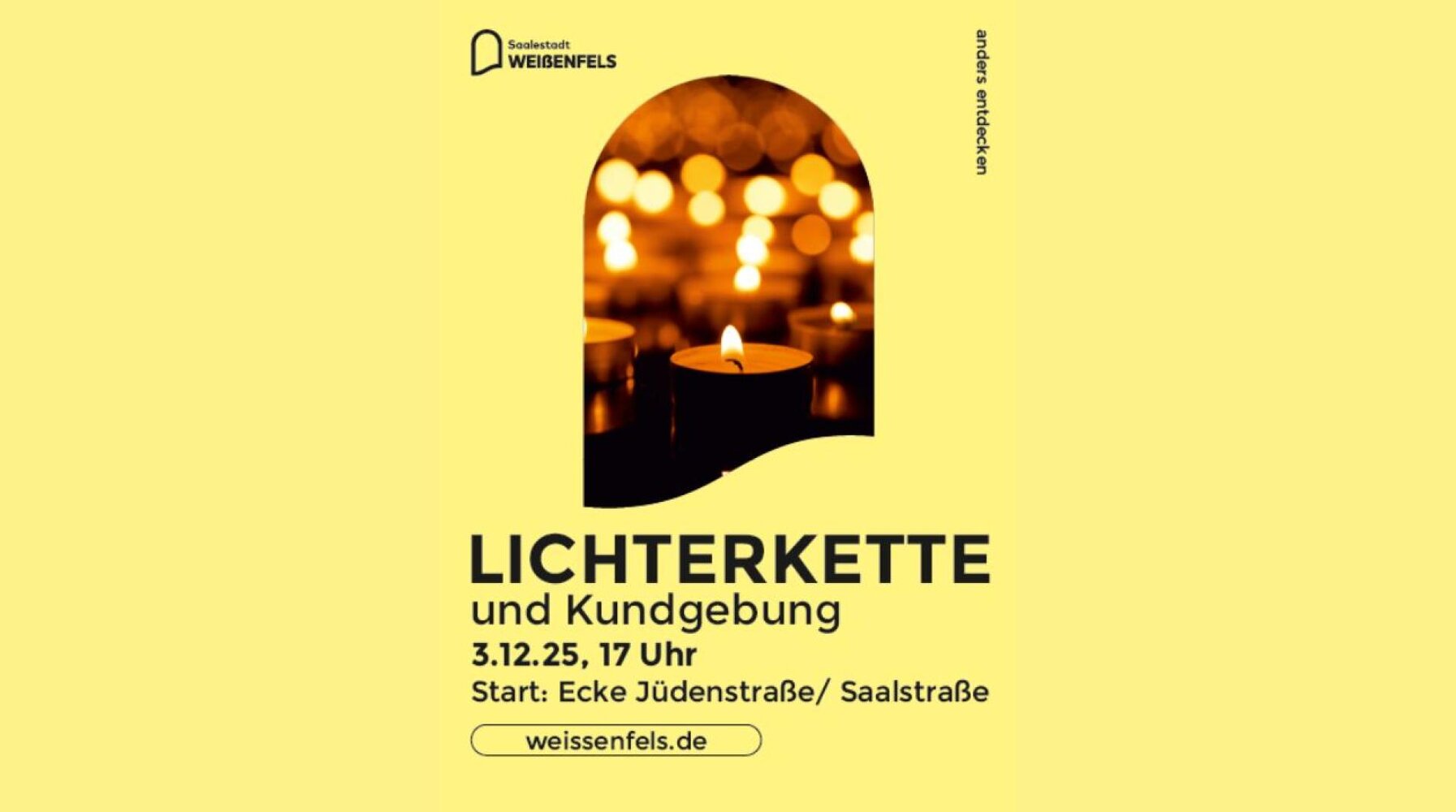 Der Behindertenbeirat der Stadt Weißenfels und das Örtliche Teilhabemanagement laden ein zur Lichterkette und Kundgebung. Mit einem Licht in der Hand gehen wir die Strecke gemeinsam. Bitte bringen Sie für sich ein Windlicht oder eine Kerze mit. Die Kundgebung findet dann auf der Fläche vor dem Rathaus statt. Die Nutzung der Mobilen Sennheisser Hörschleife ist während der Kundgebung möglich.