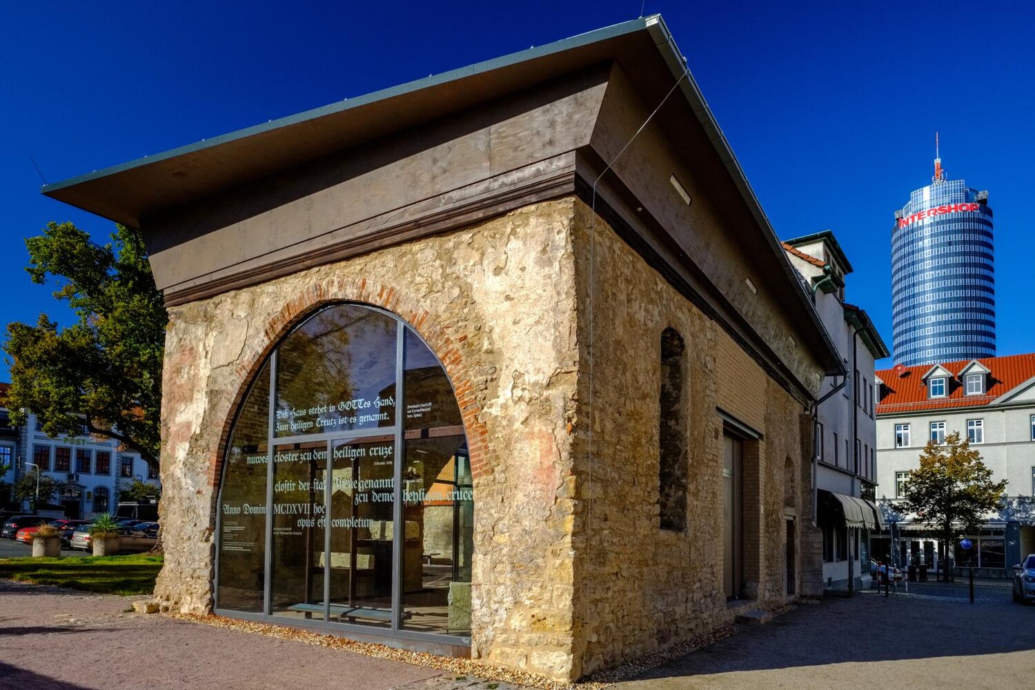 Das Karmelitenkloster in Jena ist ein historisch bedeutsames Bauwerk, das seine Ursprünge im 14. Jahrhundert hat. Gegründet wurde es im Jahr 1382, als die Karmeliten, ein Bettelorden, der sich im 12. Jahrhundert im Heiligen Land formierte und später in ganz Europa verbreitete, in Jena Fuß fassten. Im Zuge der Reformation und der damit einhergehenden Säkularisation verloren viele geistliche Gemeinschaften, so auch die Karmeliten in Jena, ihren Einfluss und ihr Eigentum. Während der Reformation wurde hier eine Druckerei eingerichtet, um die zweite Gesamtausgabe der Schriften Martin Luthers herauszugeben. Anstelle des ehemaligen Klosters eröffnet 1669 das Gasthaus "Zum goldenen Engel". Auch mit Hilfe von Bodenfunden wird die Geschichte des Ortes in der Ausstellung veranschaulicht.