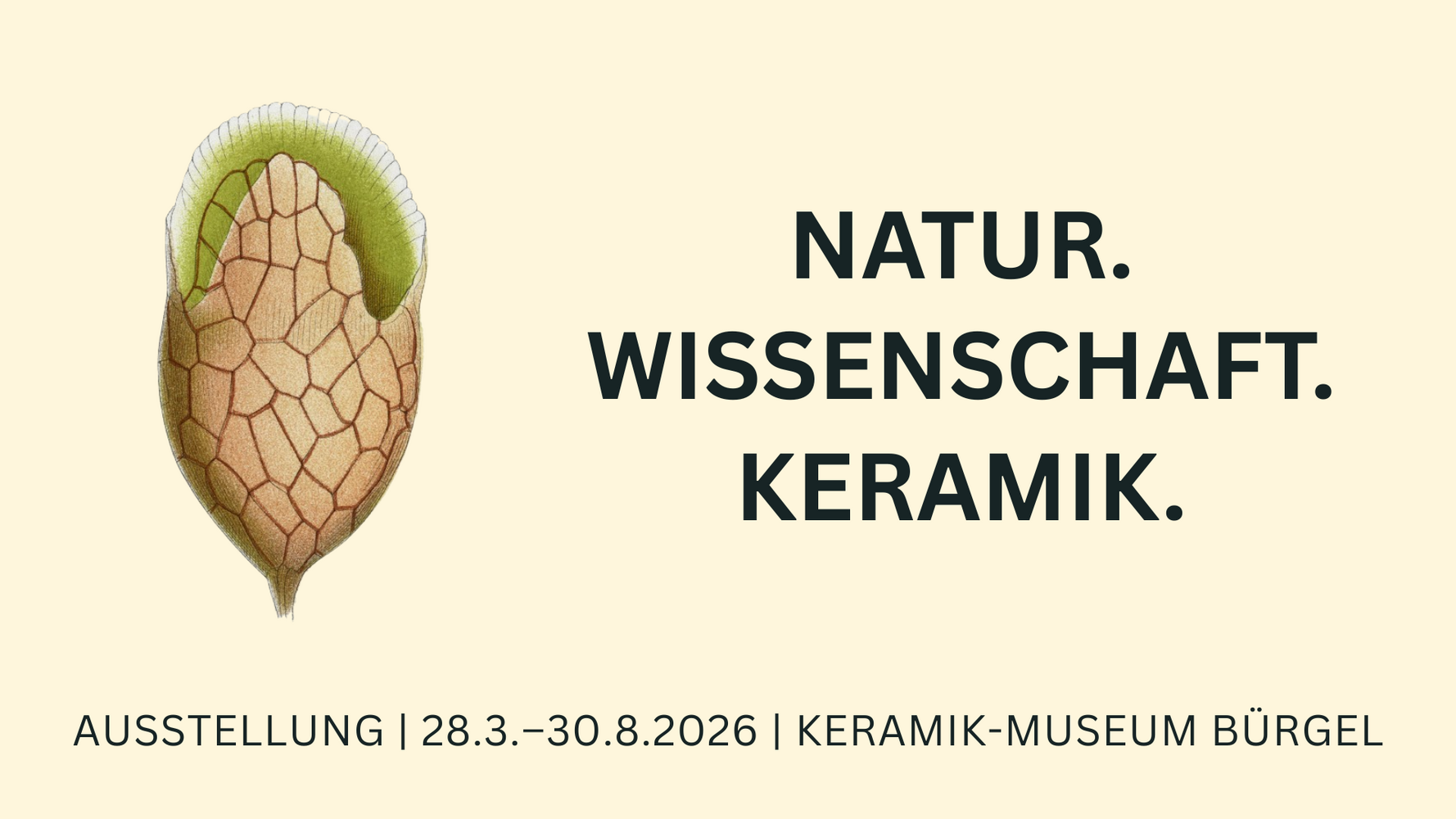 Die Ausstellung »NATUR. WISSENSCHAFT. KERAMIK.« führt naturwissenschaftliche Betrachtung und keramische Praxis zusammen. Sie versteht Form als etwas, das entsteht: aus Ordnung und Aufbau (STRUKTUR), im Prozess (ENTWICKLUNG), aus Wandel über Generationen (EVOLUTION) und aus dem, was wir als Ganzes wahrnehmen (Gestaltung).
